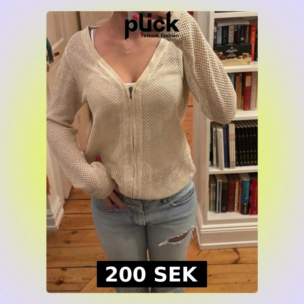 Säljer en beige mesh-kofta med dragkedja framtill.
