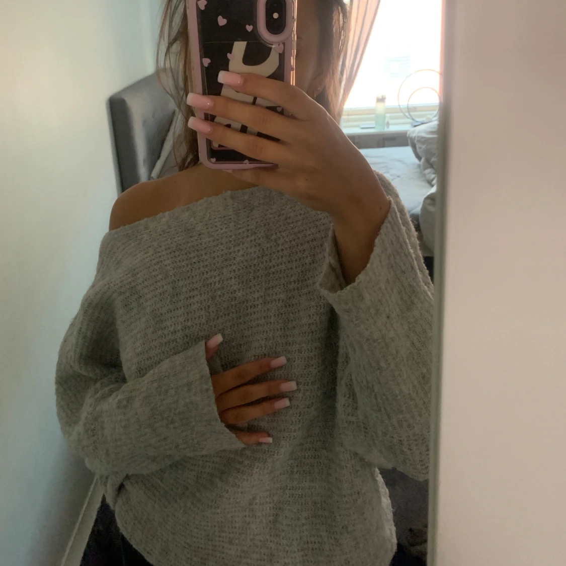 Supermysig grå stickad tröja med offshoulder-design och lång ärm. Tröjan har en loose passform och är perfekt för dig som gillar en avslappnad och trendig stil. Passar perfekt till jeans eller leggings för en chill look.