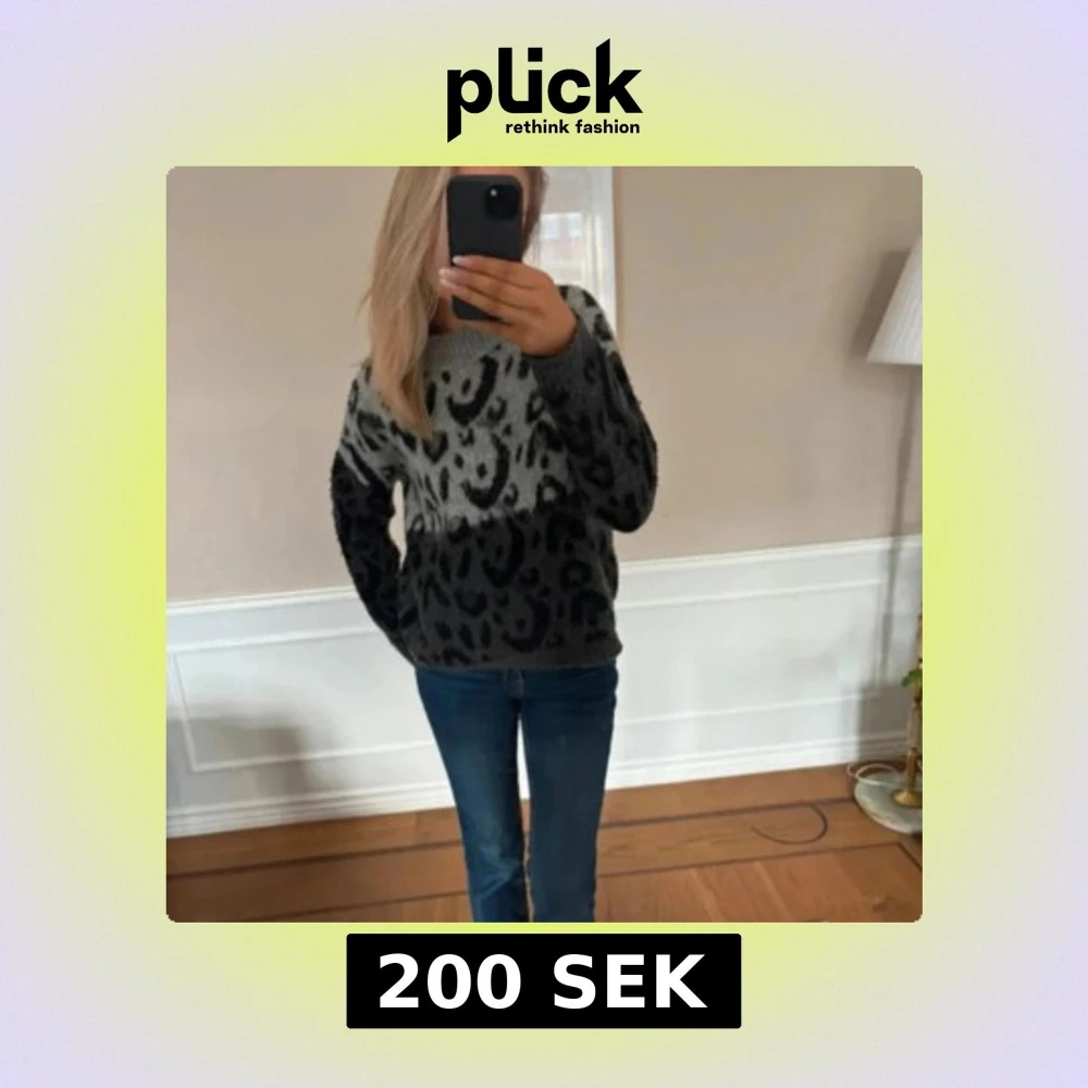 Säljer en mysig grå och svart tröja med leopardmönster. Tröjan har långa ärmar och en rund halsringning. Perfekt för att hålla sig varm och stilren under kyligare dagar.