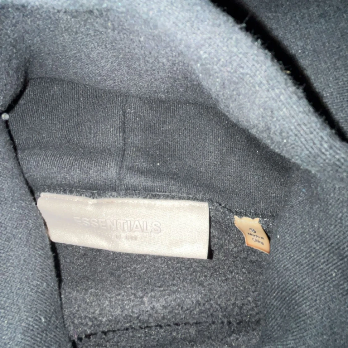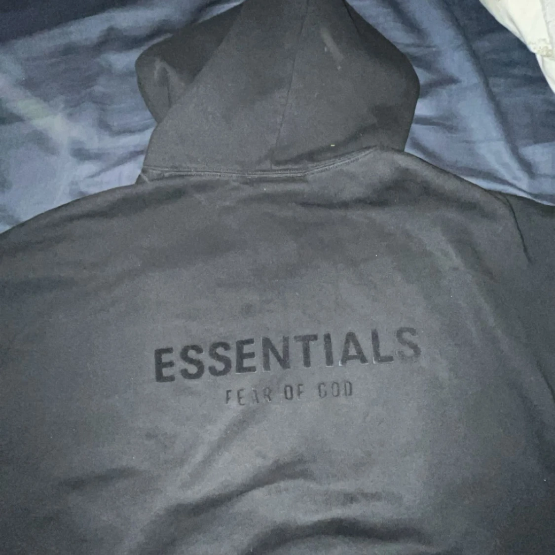 Säljer en svart hoodie från Essentials Fear of God. Tröjan har en klassisk passform med huva och tryckt logga både fram och bak. Perfekt för dig som gillar streetwear och vill ha en stilren look.