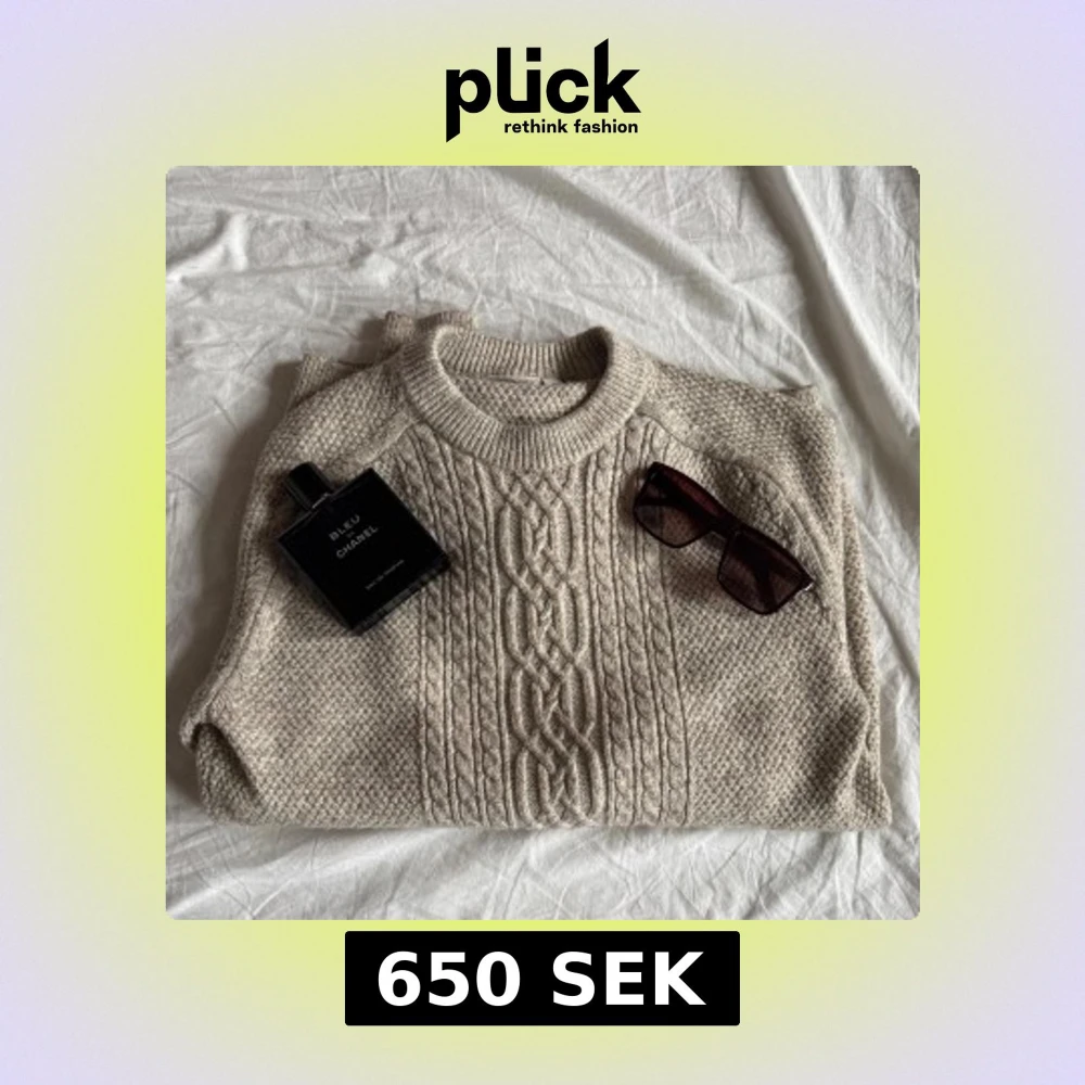 Säljer en beige stickad tröja med snyggt flätmönster framtill. Tröjan har rund halsringning och långa ärmar, perfekt för kyliga dagar. Den är mjuk och skön, passar dig som gillar en klassisk men ändå trendig look, i storlek small men luras inte av storlek eftersom jag är mellan M/L och passar mig fint.