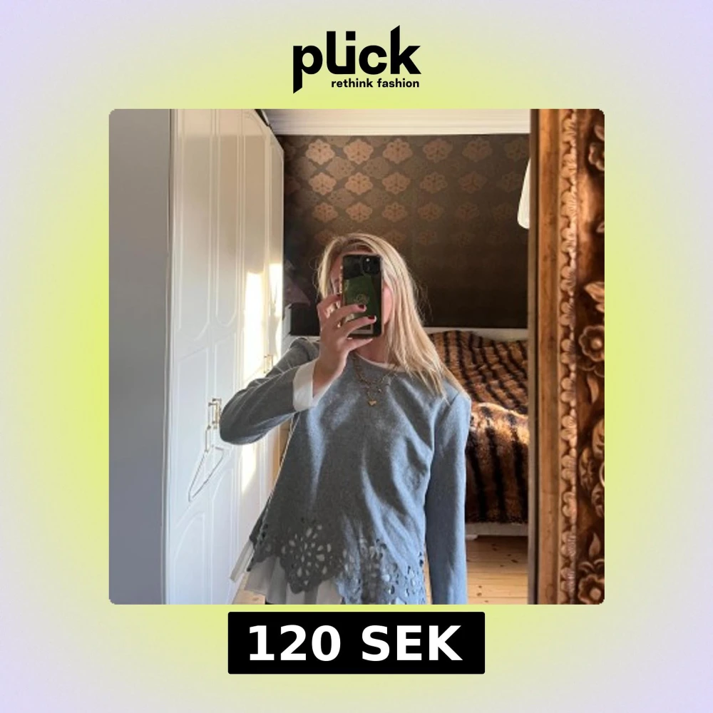 Säljer en stilren grå tröja med vackra spetsdetaljer längs nederkanten. Tröjan har långa ärmar och en lös passform, perfekt för en avslappnad look. Passar bra till både jeans och kjol.
