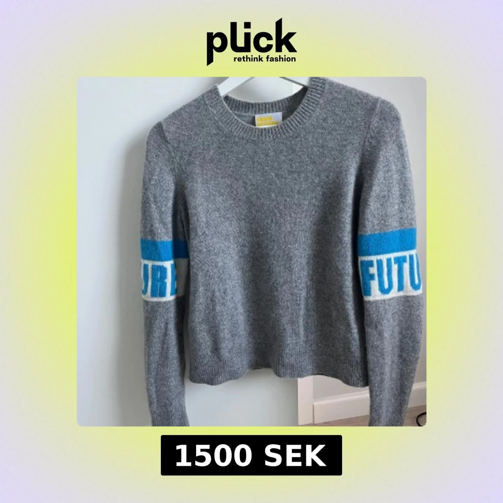 Säljer denna gråa stickade tröja i 100% kashmir från From Future. Den har blå och vita detaljer med texten FUTURE på båda ärmarna🩷