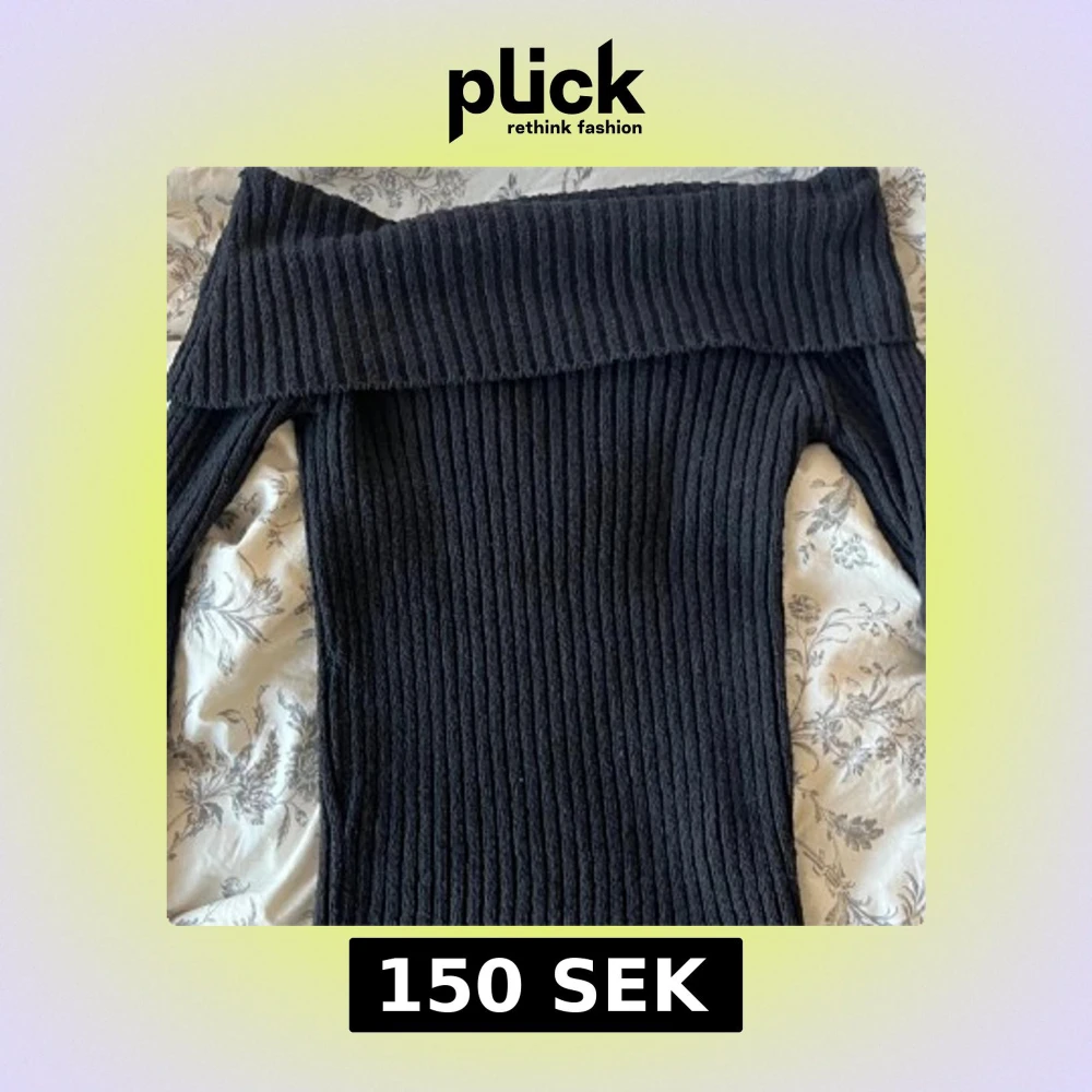 Säljer en svart ribbstickad tröja med offshoulder-modell och långa ärmar. Tröjan är tight och har en bred, vikt kant upptill som ger en snygg detalj. Perfekt för dig som gillar en stilren och trendig look.
