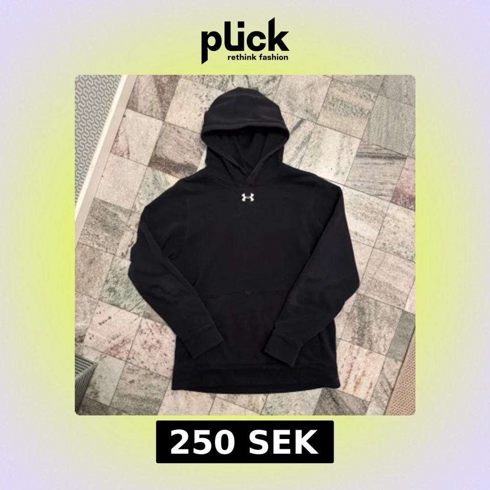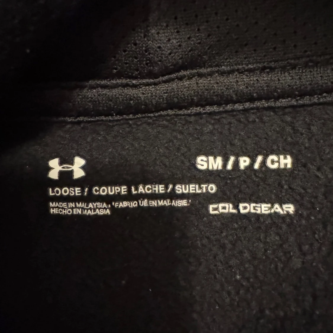 Säljer en svart hoodie från Under Armour med deras logga på bröstet. Den har en bekväm passform och är perfekt för kyligare dagar tack vare ColdGear-materialet. Hoodien har en stor ficka framtill och långa ärmar.
