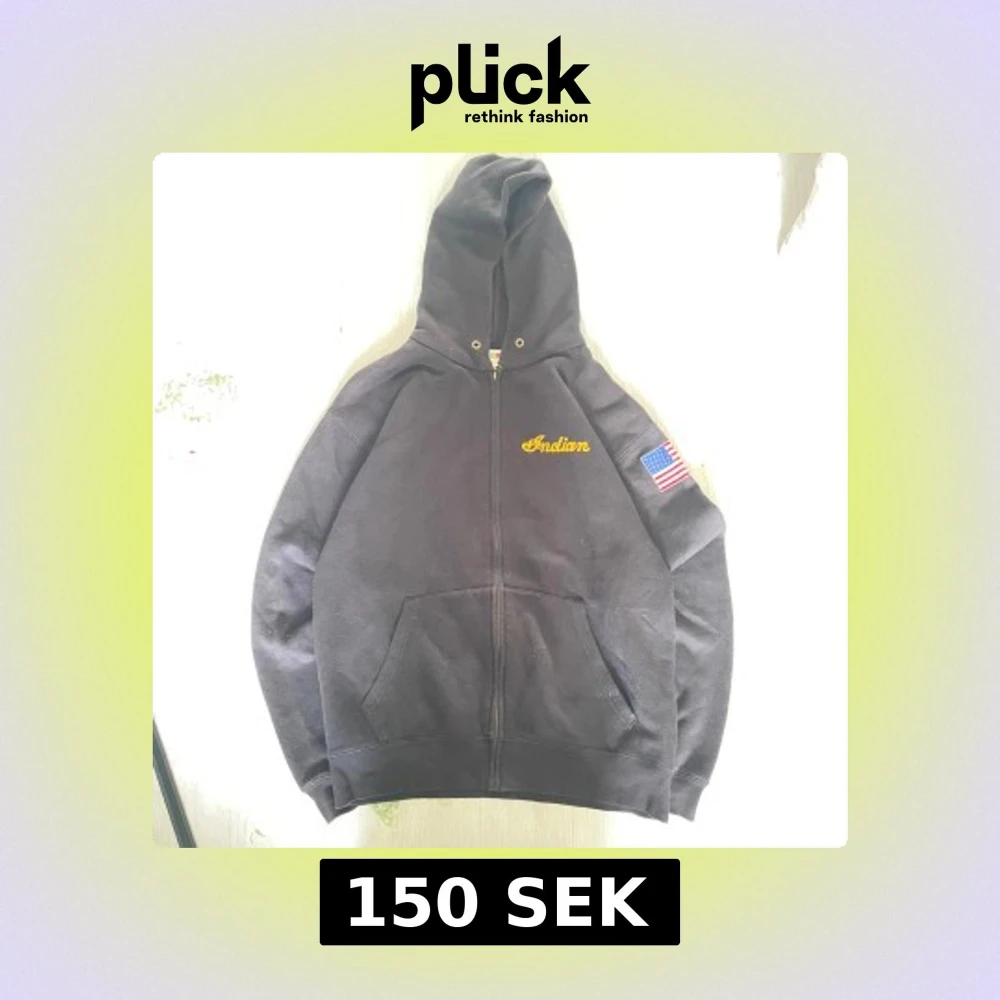 Svart hoodie med dragkedja från Fruit of the Loom. Broderad gul Indian-logga på bröstet och stor logga med vinge på ryggen. Amerikansk flagga på ena ärmen. Klassisk känguruficka och huva med metallöljetter.