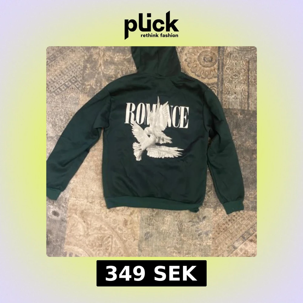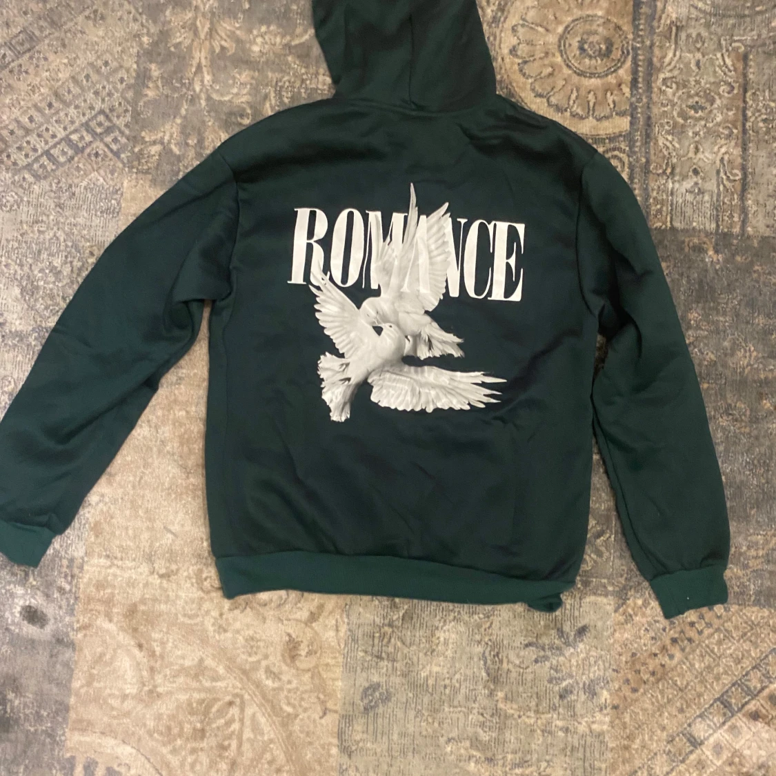 Säljer en mörkgrön hoodie från Romance med stor vit text och duvor tryckta på ryggen. Framsidan har en mindre Romance-logga och en klassisk magficka. Tröjan har huva med snörning och långa ärmar, perfekt för chill dagar.