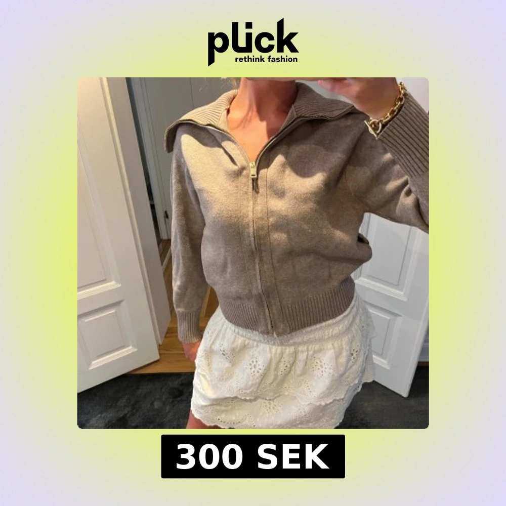 Säljer en beige stickad kofta med ribbad krage som kan bäras både uppvikt och nedvikt. Tröjan har hel dragkedja framtill, långa ärmar. Perfekt tröja om man vill ha något under men också som basplagg