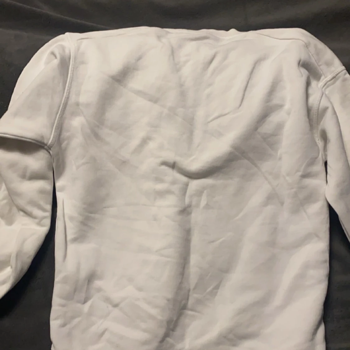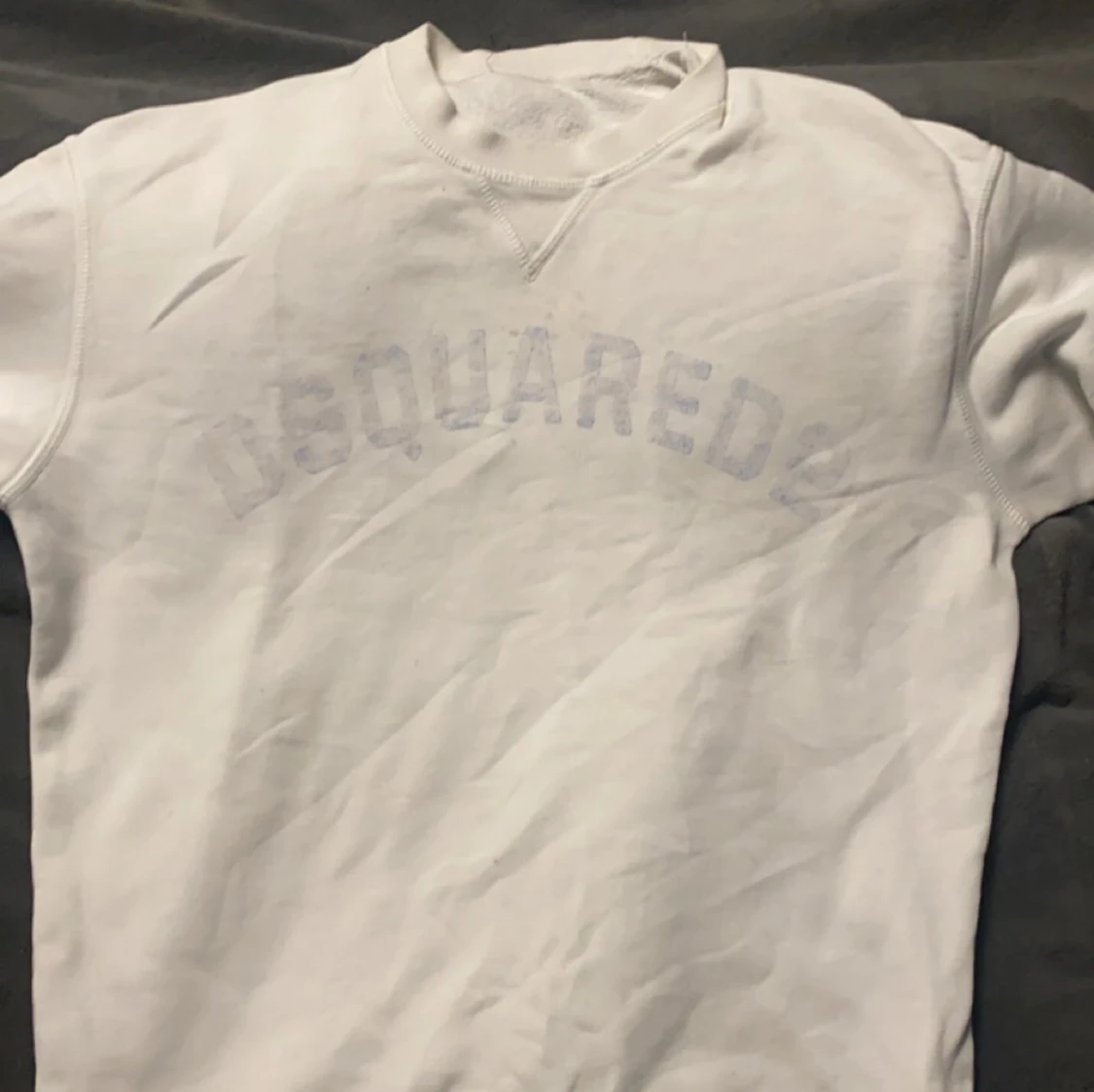Säljer en vit sweatshirt från Dsquared2 med subtilt tryck på framsidan. Tröjan har långa ärmar och en klassisk rund halsringning. Perfekt för en avslappnad stil.