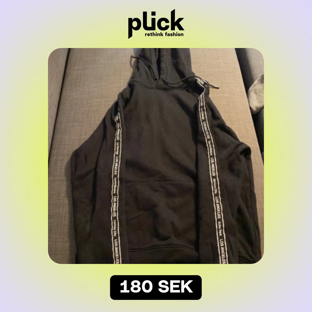 Säljer en svart hoodie med coola band där det står 'Los Angeles' längs med ärmarna. Den har en klassisk huva och en stor ficka fram. Perfekt för en avslappnad stil eller när du vill ha något bekvämt att mysa i.