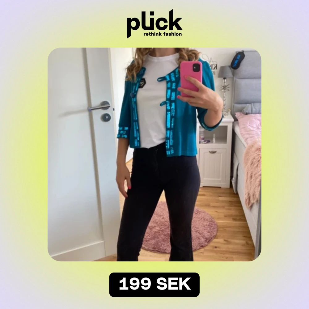 Säljer en snygg turkos kofta med glittriga paljettdetaljer längs kanterna och ärmsluten. Koftan har trekvartsärmar och en öppen design med knytning framtill. Perfekt för att liva upp en outfit! 💙