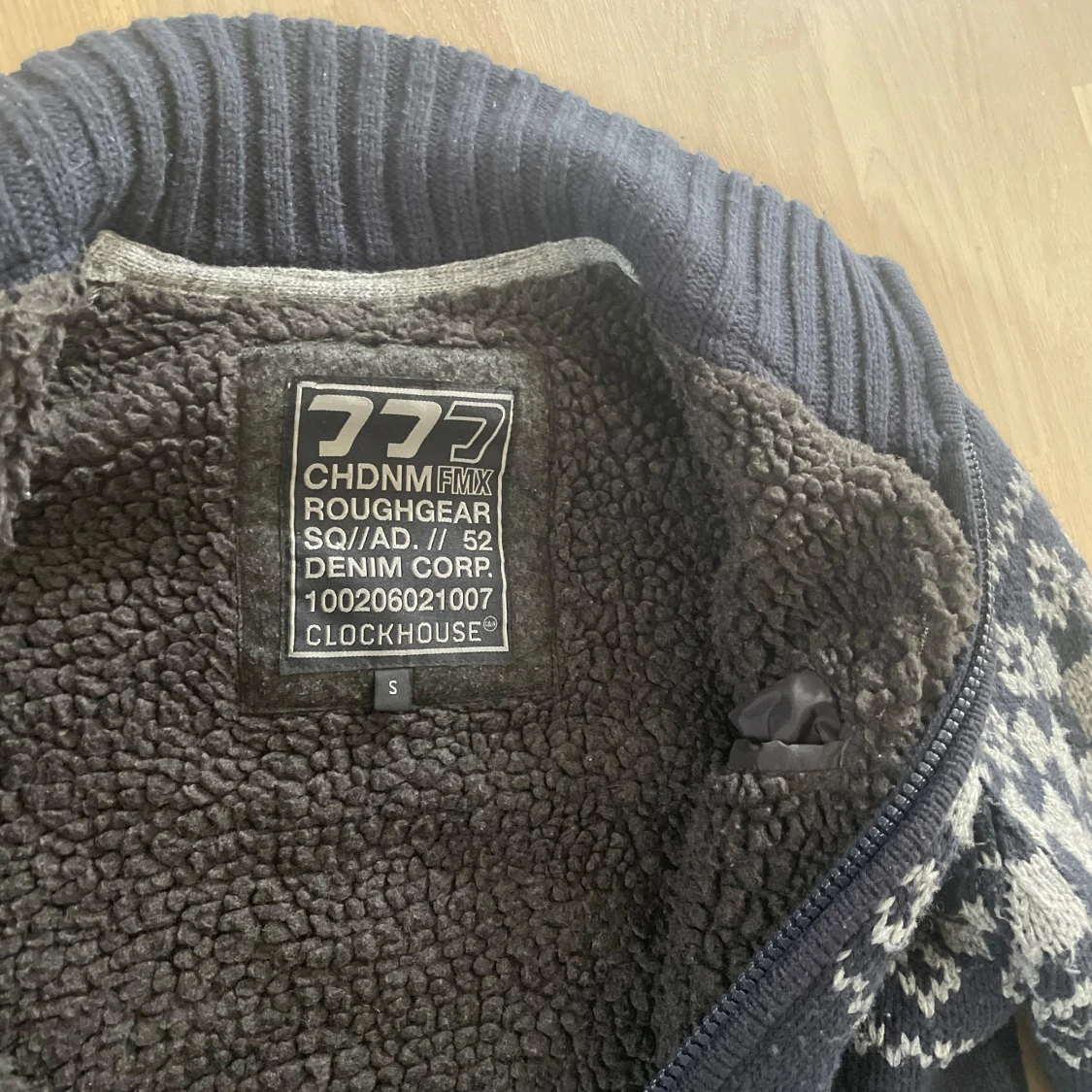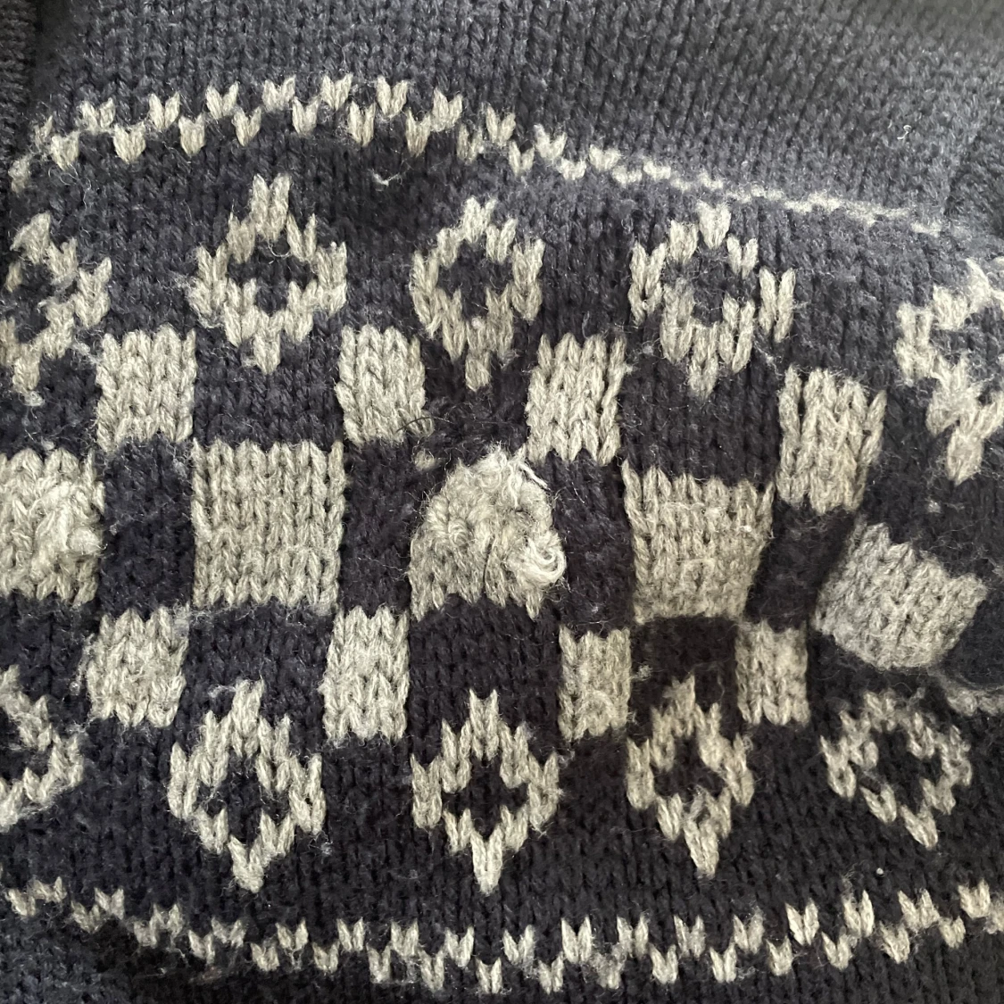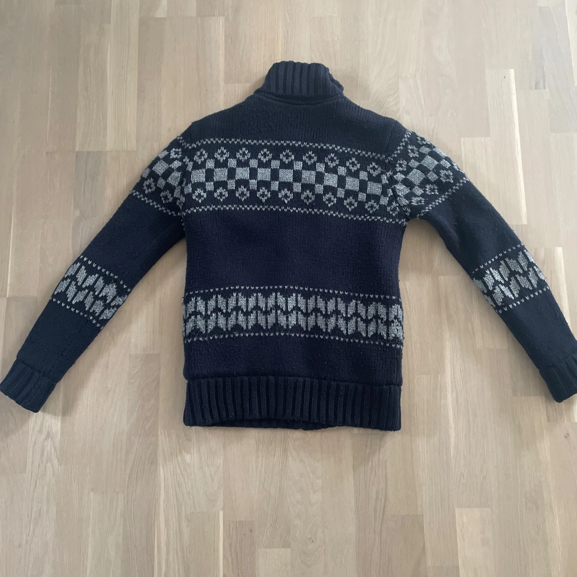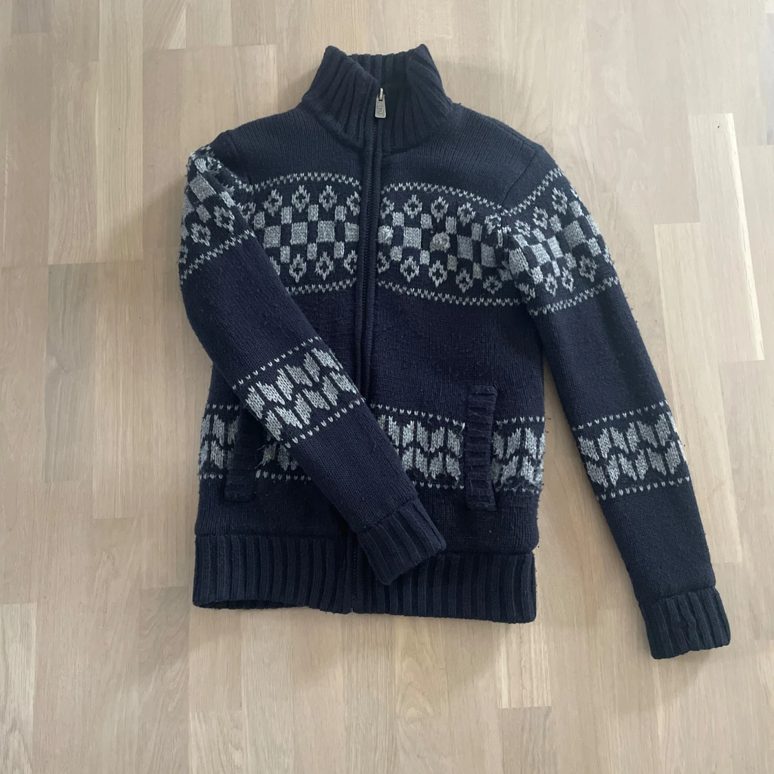 Mysig mörkblå stickad kofta från Clockhouse med grått mönster och hel dragkedja. Insidan är fodrad med mjuk fleece för extra värme. Koftan har hög krage, ribbade muddar och två fickor framtill. Perfekt för kalla dagar och snygg till jeans. Har haft ett hål som jag har sytt igen men inget som märks (syns på sista bilden)