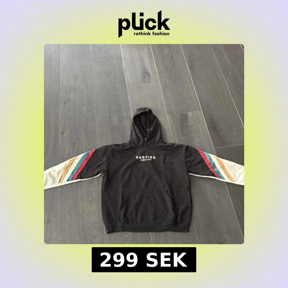 Svart hoodie från Kaotiko med huva och coola färgade ränder i rött, blått och beige längs ärmarna. Tröjan har känguruficka framtill och tryckt logga på bröstet. Perfekt för dig som gillar streetstyle och vill sticka ut lite extra.