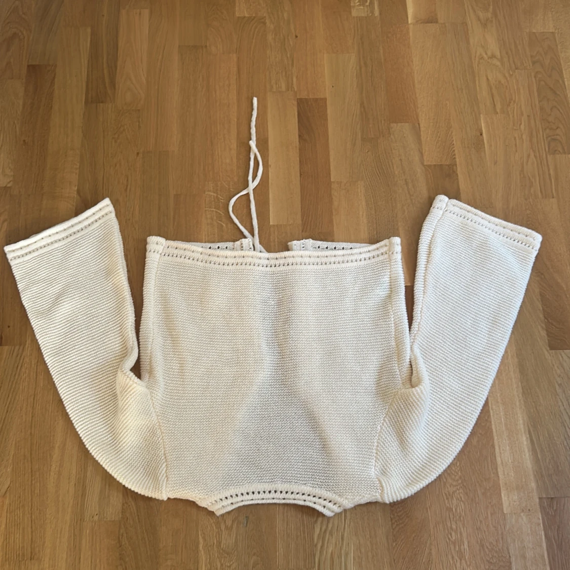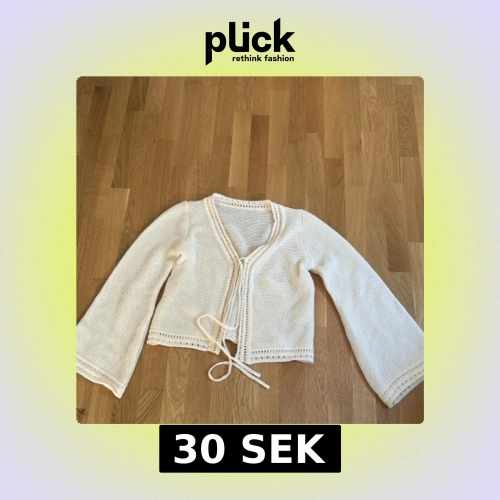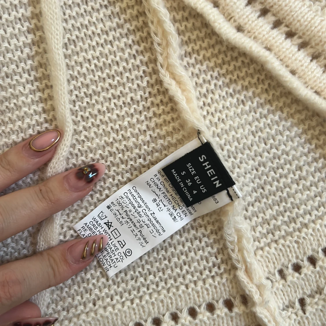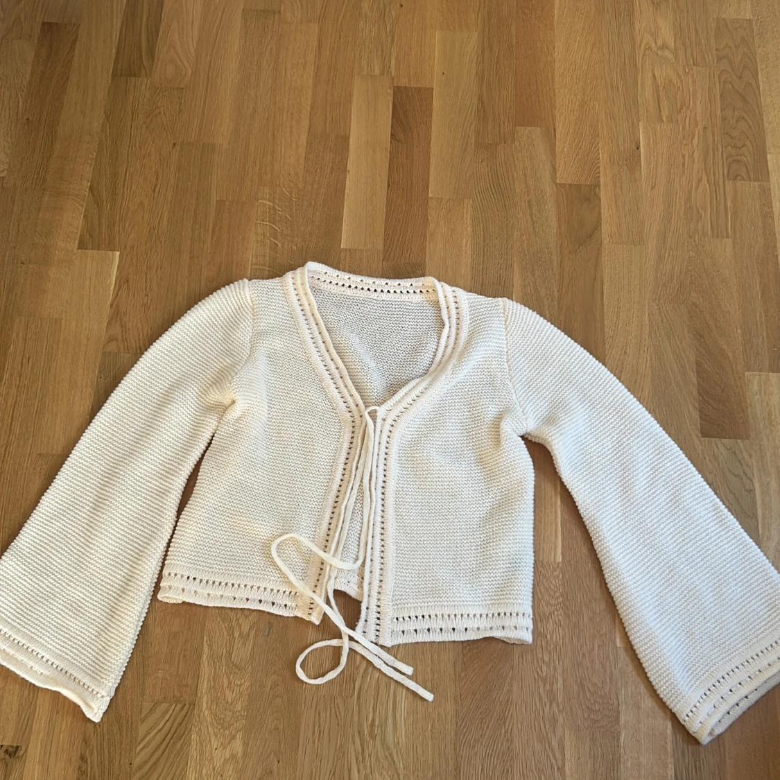 Supersöt beige stickad kofta från SHEIN med långa trumpetärmar och knytband framtill. Koftan har fina virkade detaljer längs kanterna och är perfekt för lager-på-lager. Mjuk och skön, passar till allt.