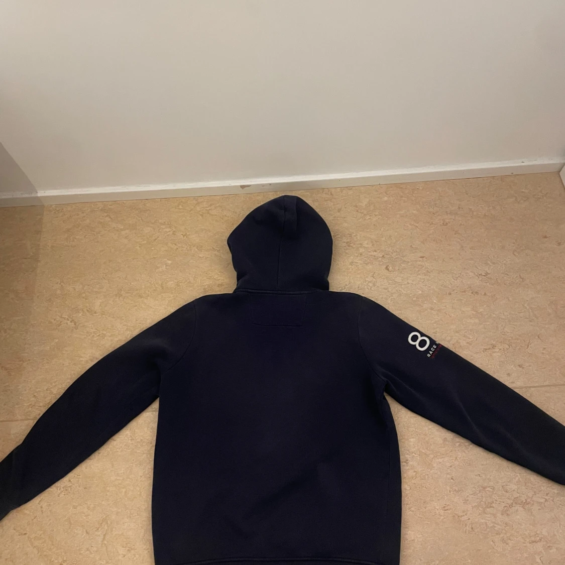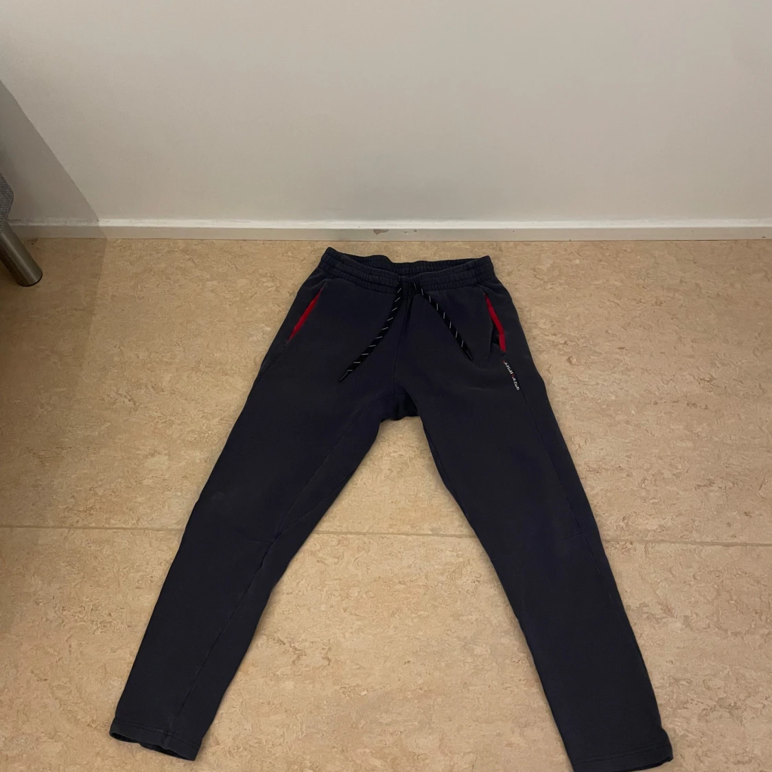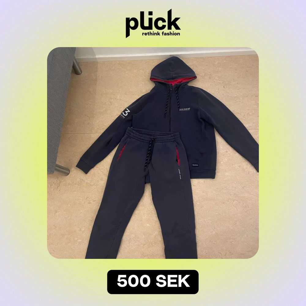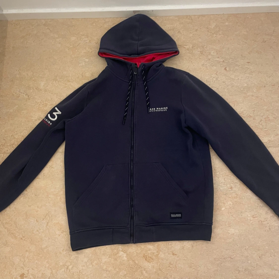 Säljer en snygg mörkblå hoodie från Race Marine Den har en dragkedja framtill och en huva med röd insida. Använd cirka 8 gånger. Perfekt för kyliga dagar eller som en casual look. Passar både till vardags och träning. Koftan är i storlek M och byxan i storlek S. Såklart går det att köp dessa separat också. ABS! Pris går att diskutera.