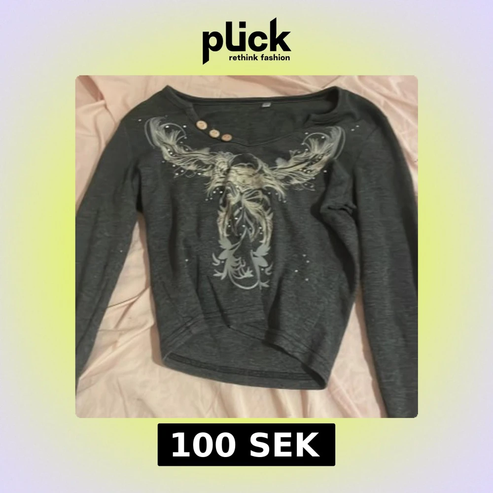 Säljer en mörkgrå långärmad tröja i storlek S med ett detaljerat vitt tryck framtill som liknar ett konstnärligt djurmotiv. Tröjan har tre träfärgade knappar vid halsringningen och är ribbad i materialet. Passar dig som gillar unika detaljer och snygga prints.