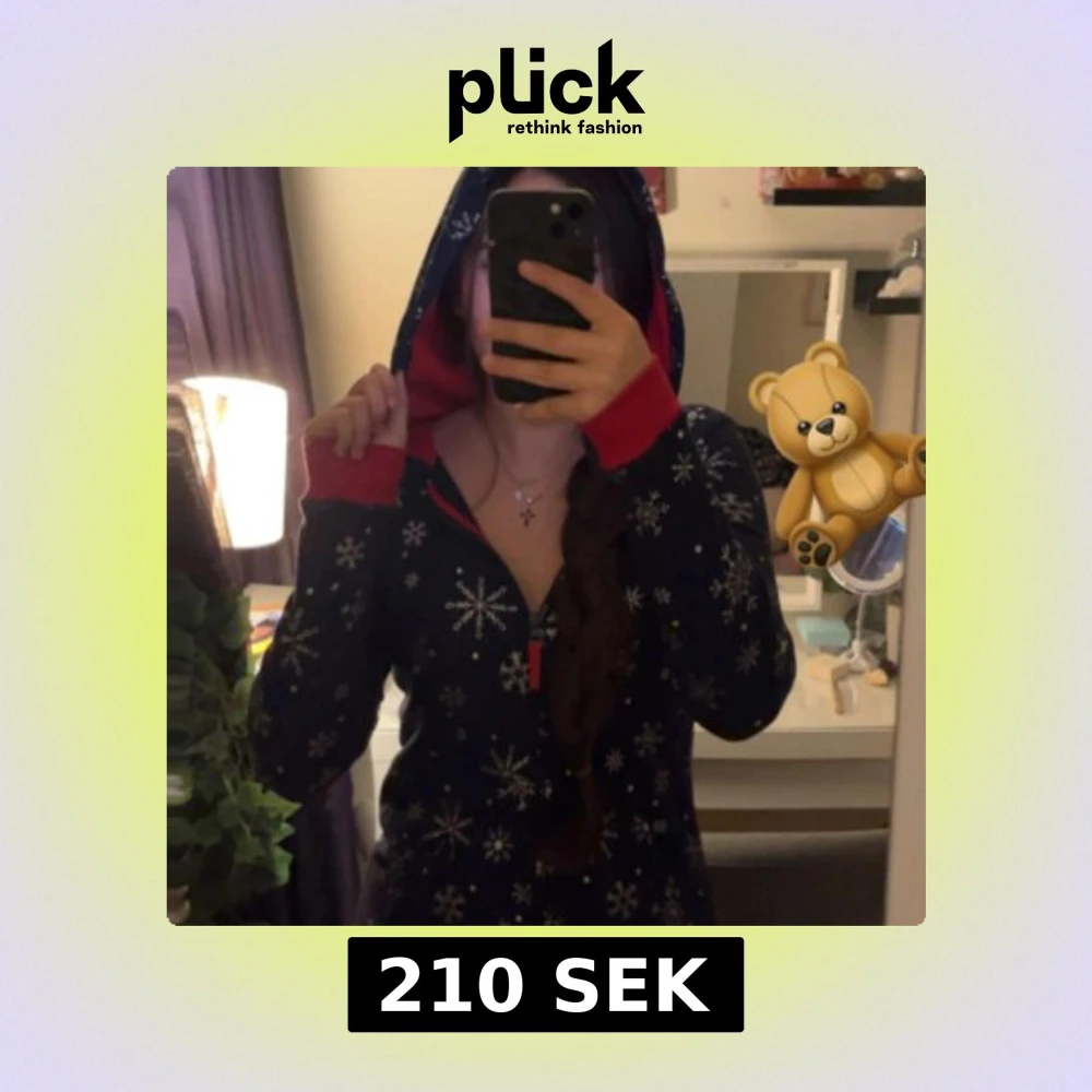 Mysig mörkblå hoodie med vita snöflingor och röda detaljer på muddar och insida av huvan. Tröjan har dragkedja framtill och en stor huva, perfekt för kalla dagar. Snygg och bekväm stil som sticker ut!