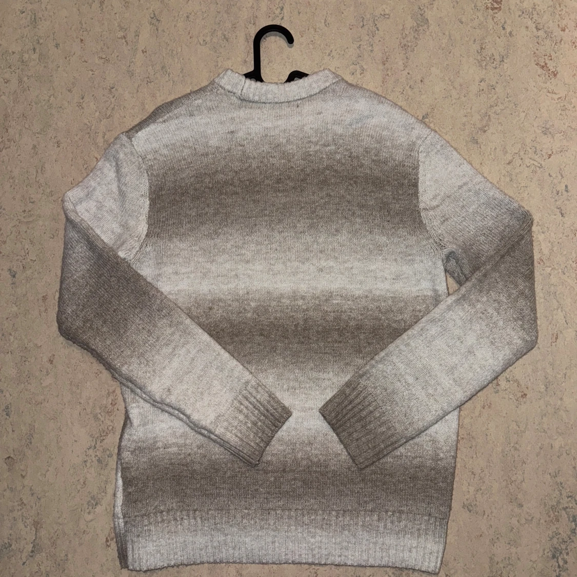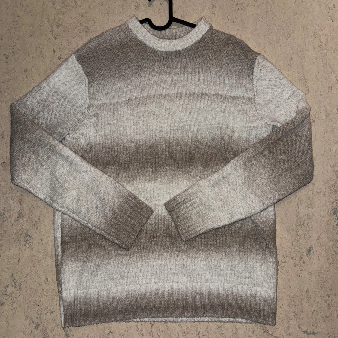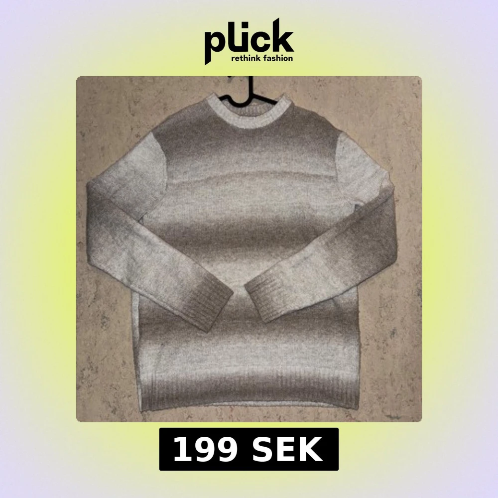 Säljer en stickad tröja i gråmelerade toner med mjuk övergång mellan ljusgrått och mörkgrått. Tröjan har rund halsringning, långa ärmar och ribbade muddar vid ärmslut och nederkant. Perfekt för lager-på-lager under kyliga dagar.