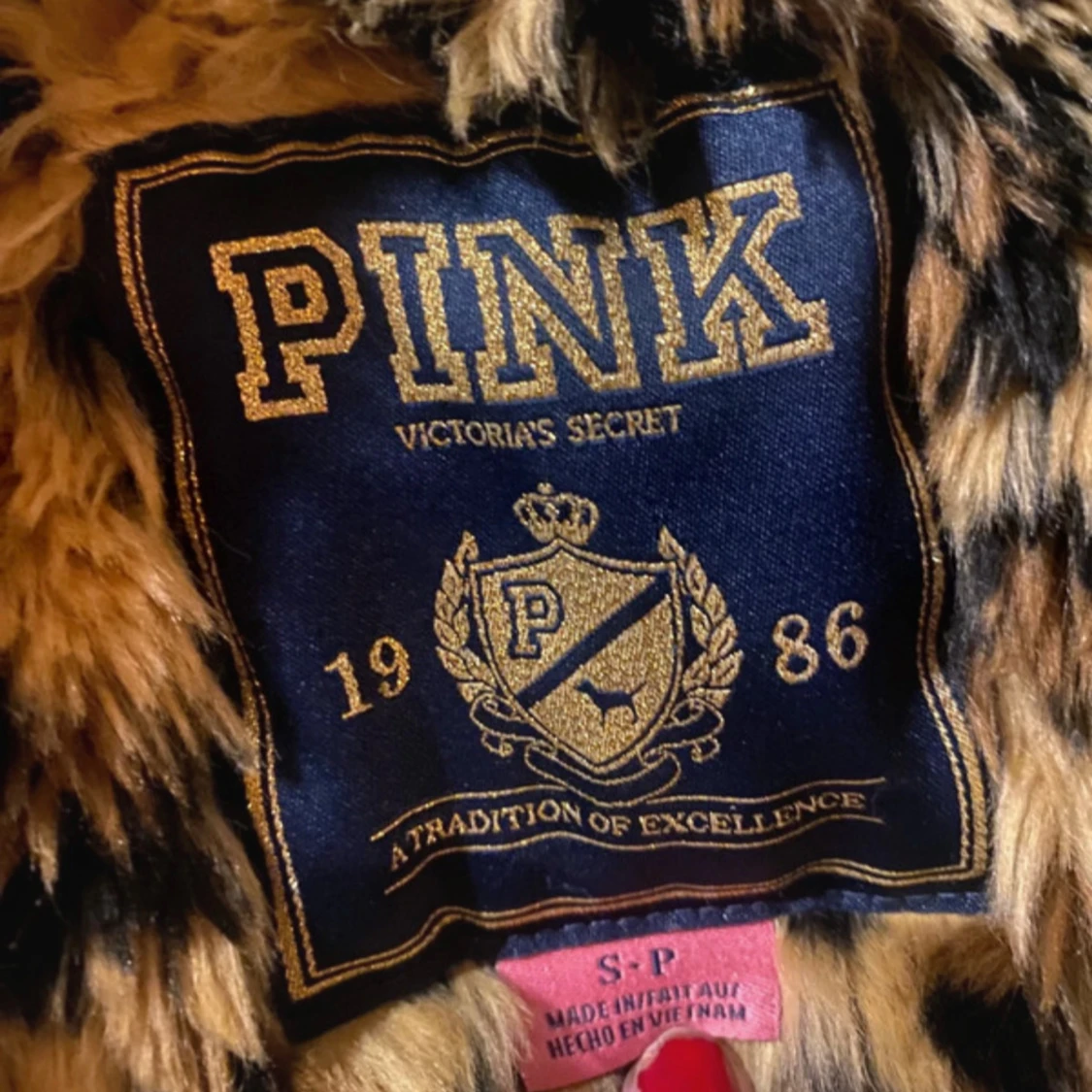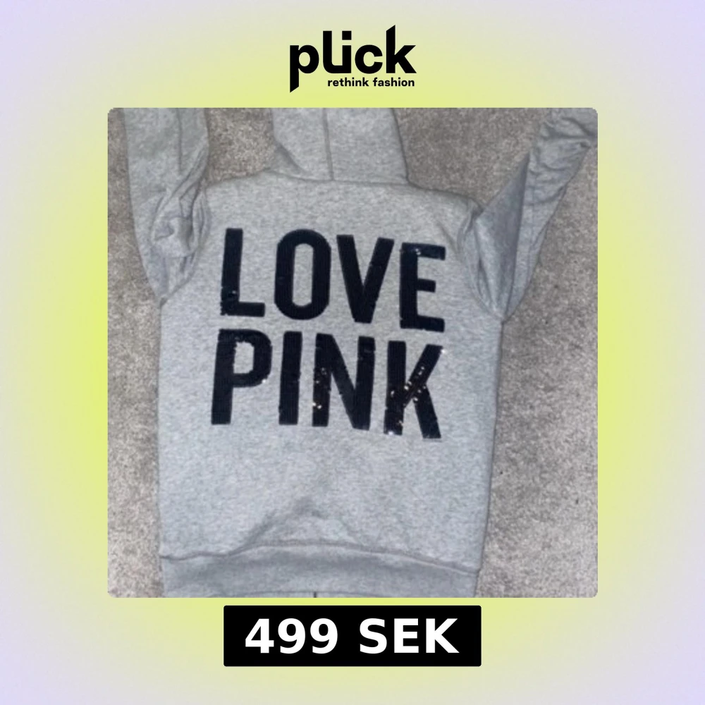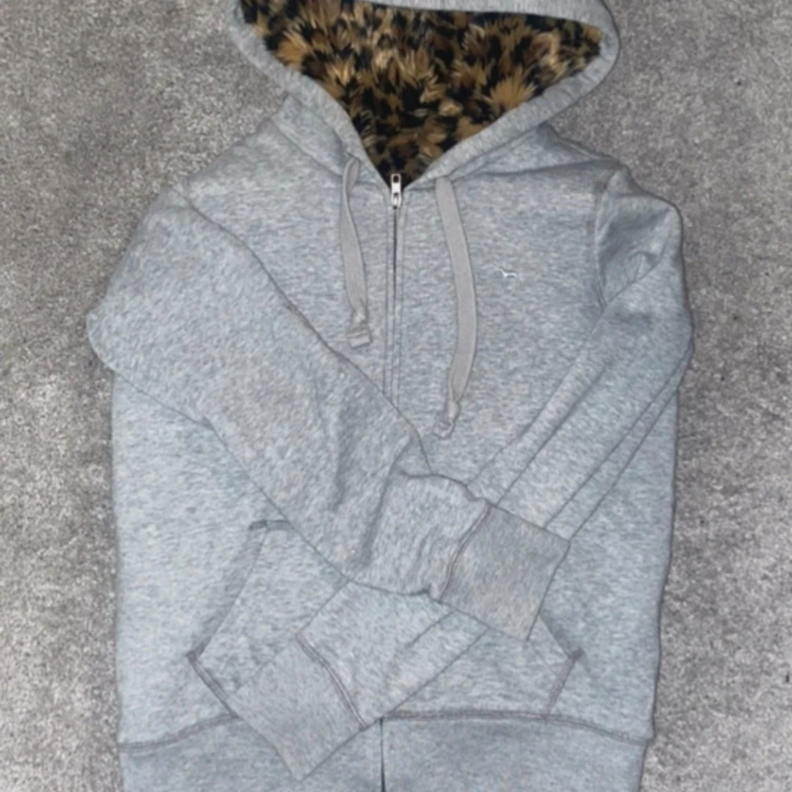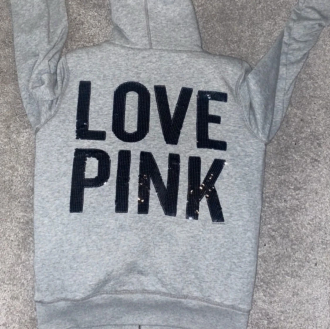 Grå hoodie från PINK by Victoria's Secret med dragkedja och huva. Insidan av huvan har ett mjukt leopardmönstrat foder. Baksidan har stora svarta paljettbokstäver med texten 'LOVE PINK'. 💕💕