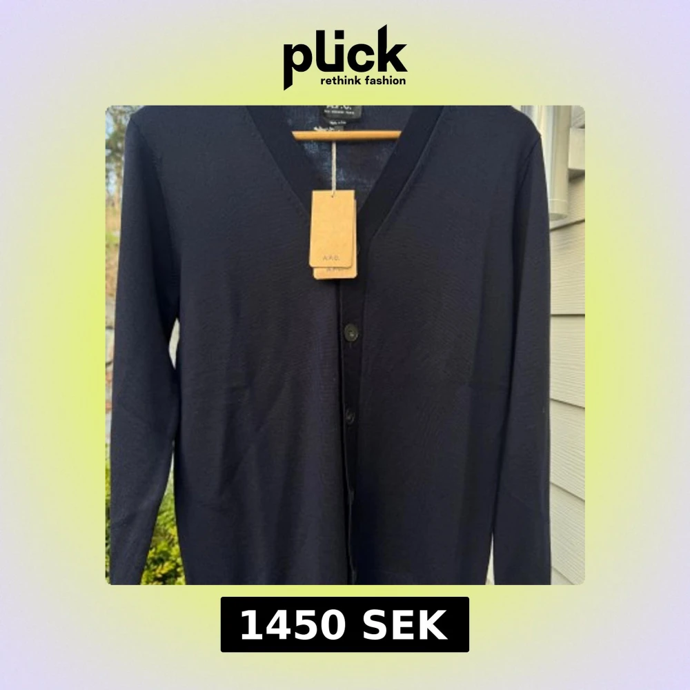 Snygg mörkblå kofta från A.P.C. med v-ringning och knappar framtill. Tillverkad i Italien av mjuk och tunn ull, perfekt för lager-på-lager. Klassisk och stilren design med långa ärmar och ribbade muddar. Taggen sitter kvar.
