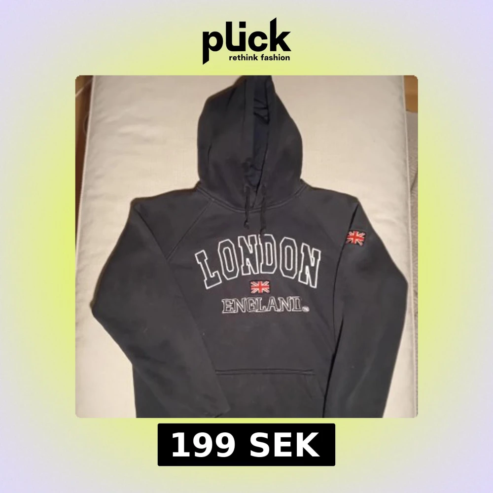 Svart hoodie med stor vit broderad text 'LONDON ENGLAND' och Union Jack-flagga på bröstet och ärmen. Tröjan har huva med snörning och en klassisk känguruficka framtill. Perfekt för dig som gillar streetwear och vill ha en chill look.