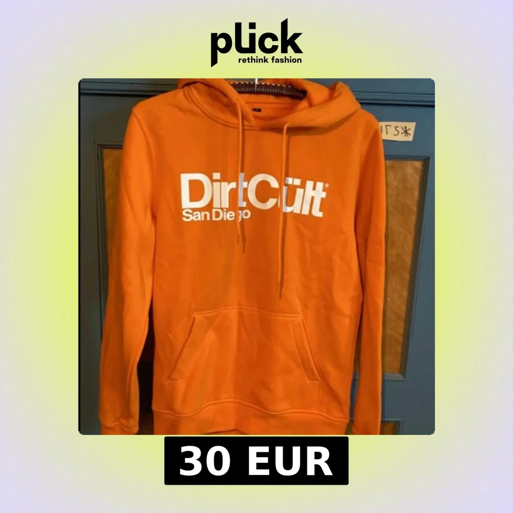 Säljer en orange hoodie från DirtCult med vit logga och texten 'San Diego' på bröstet. Tröjan har huva med snörning, magficka och långa ärmar. Perfekt för dig som gillar streetwear och vill sticka ut med färg.