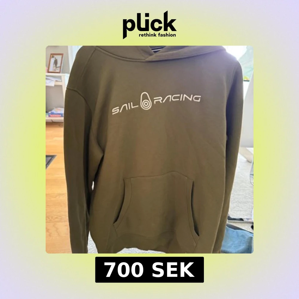 Olivgrön hoodie från Sail Racing med vit logotyp på bröstet. Tröjan har en stor magficka, huva och långa ärmar. Mjuk bomullskänsla och klassisk passform. Inga hål eller fläckar, knappast använd. Om du har fler frågor eller är intresserad, skriv privat