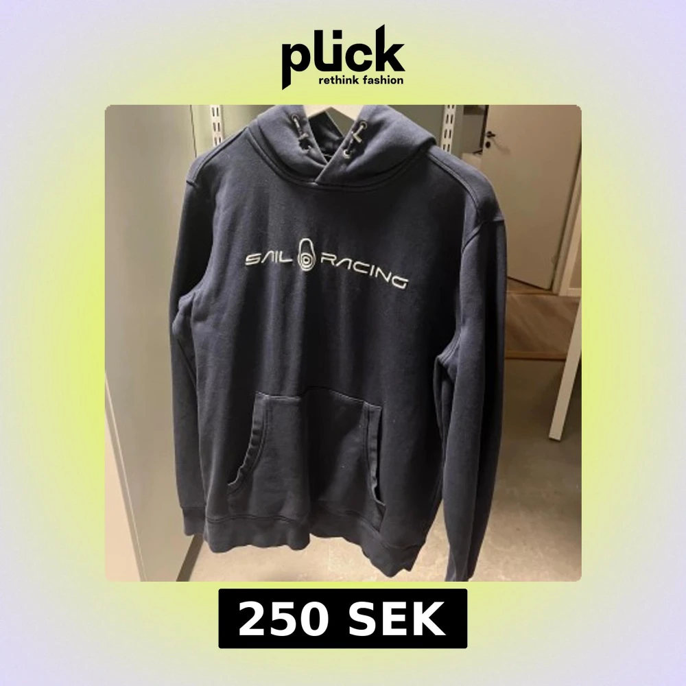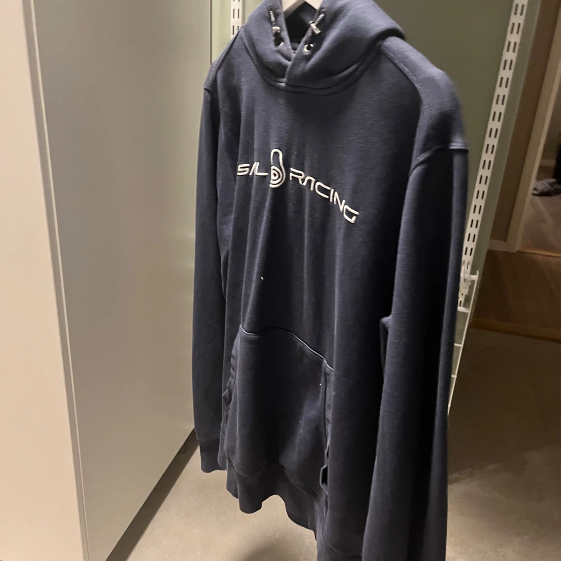 Säljer en mörkblå hoodie från Sail Racing med vit logga på bröstet. Tröjan har en klassisk känguruficka och justerbar huva med snörning. Perfekt för en avslappnad stil.