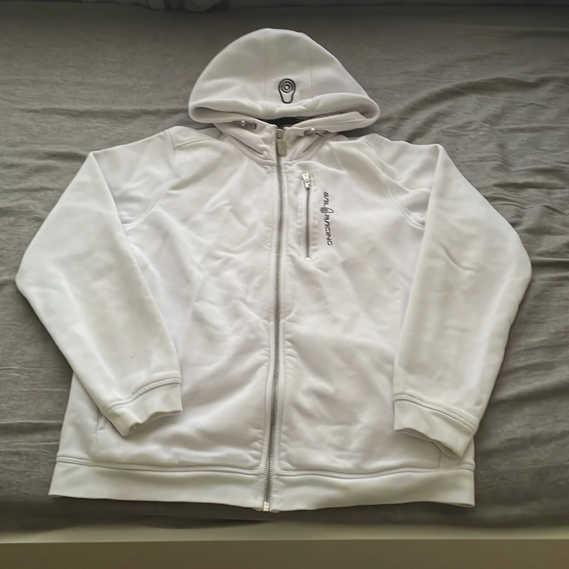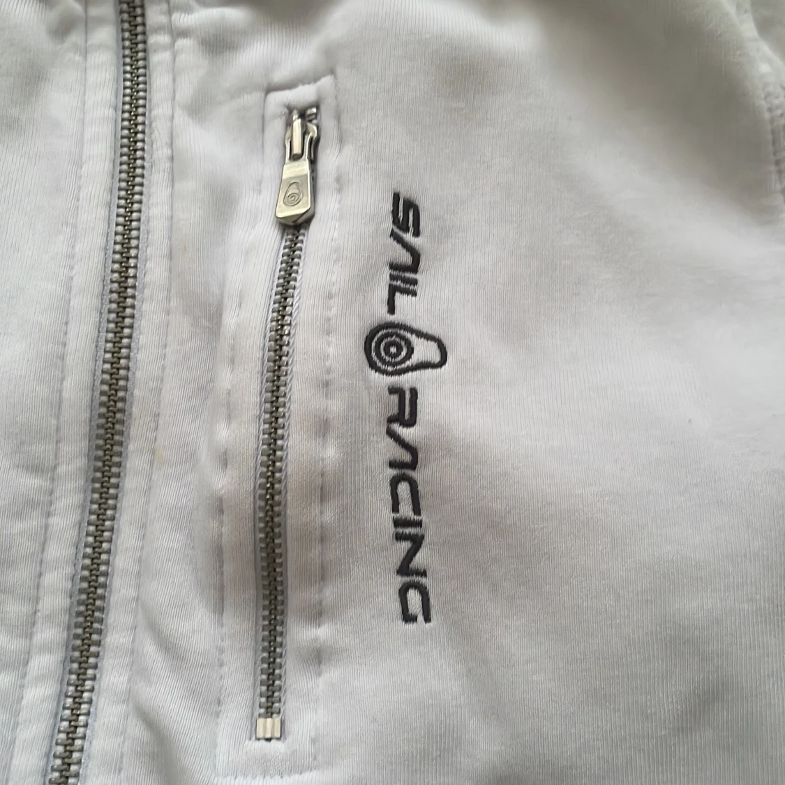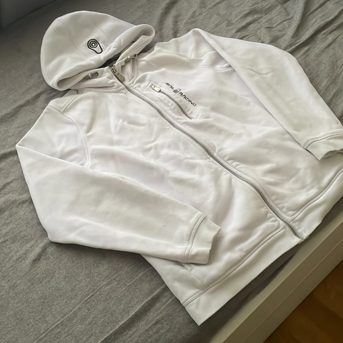 Vit hoodie från Sail Racing med dragkedja hela vägen, broderad logga på bröstet och en extra ficka med dragkedja. Tröjan har huva och långa ärmar, perfekt för chill dagar. Materialet känns mjukt och sportigt. Hör av dig vid frågor mvh Alex