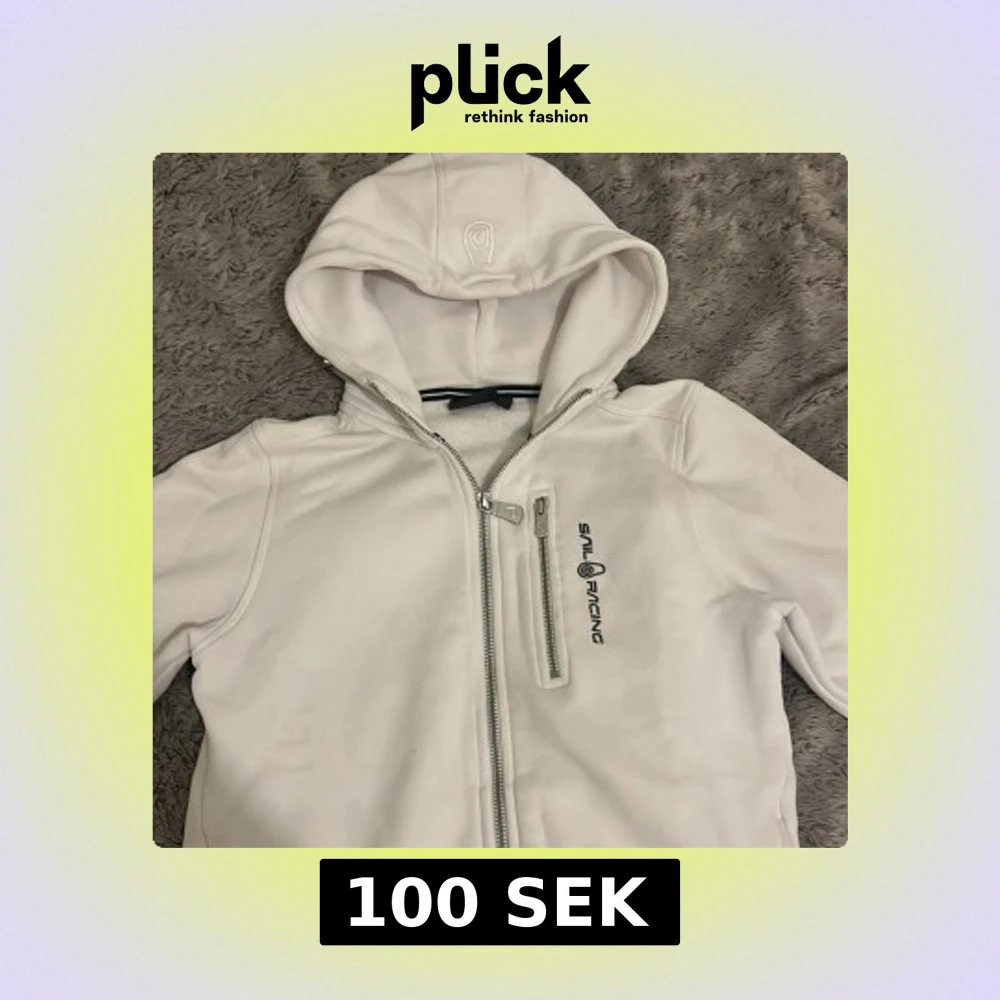 Säljer en stilren vit hoodie från Sail Racing med dragkedja och en praktisk bröstficka. Hoodien har en justerbar huva och långa ärmar. Perfekt för en avslappnad stil. Storleken är 150