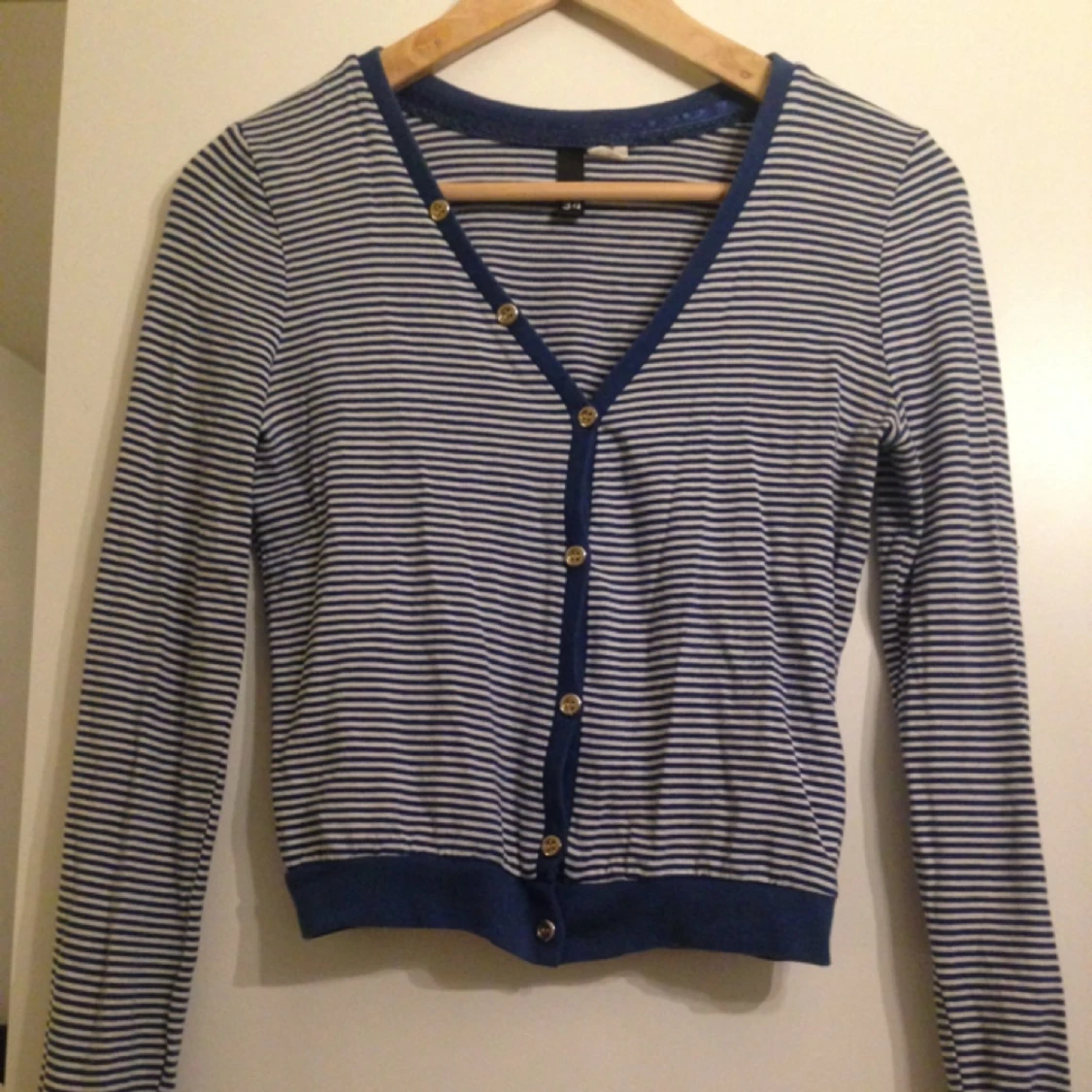 Vit och blå randig kofta från HM, Storlek Liten 34, 51% Modal 42% Bomull 7% Elastan. Bra kvalité då den har använts mycket men fortfarande känns och ser ny ut!