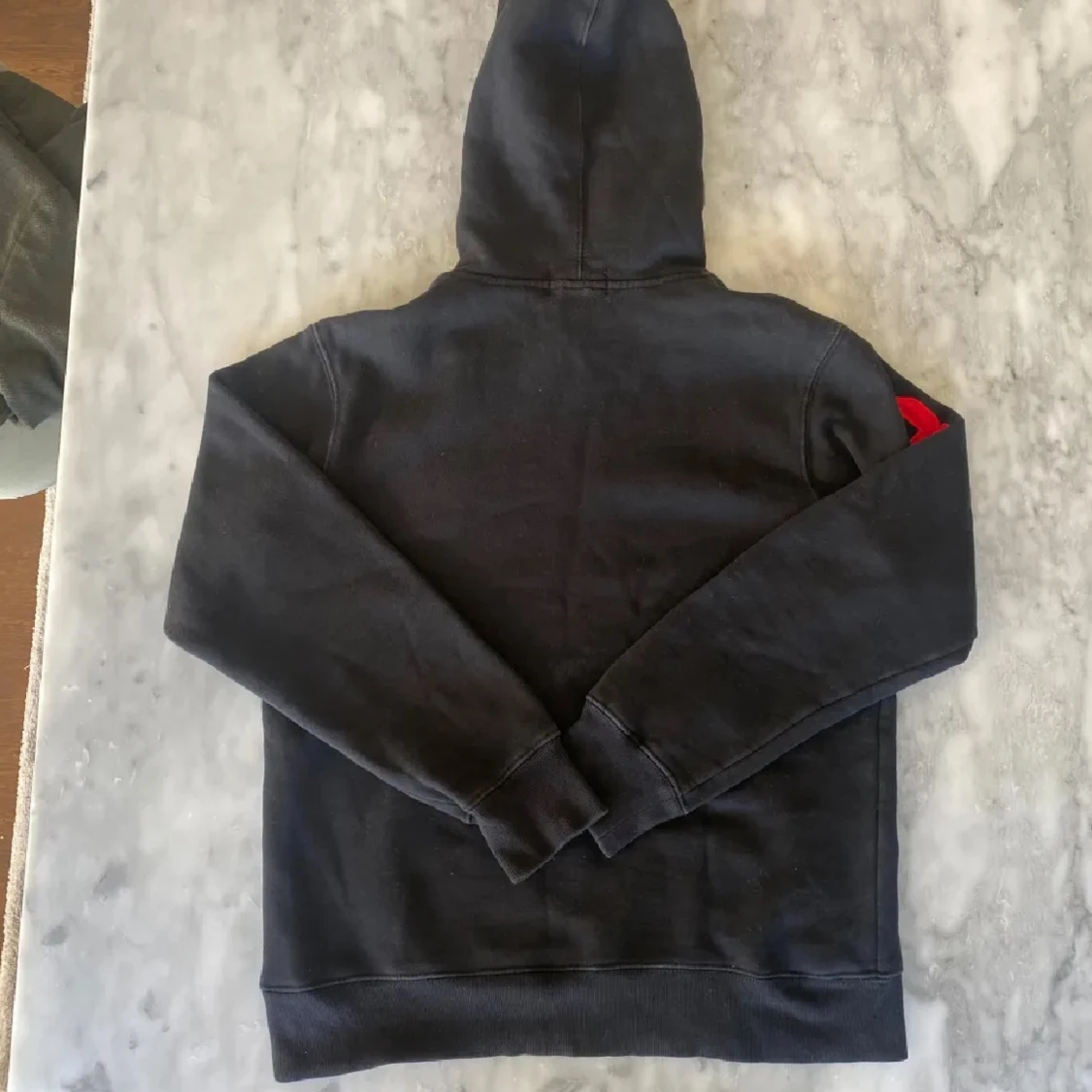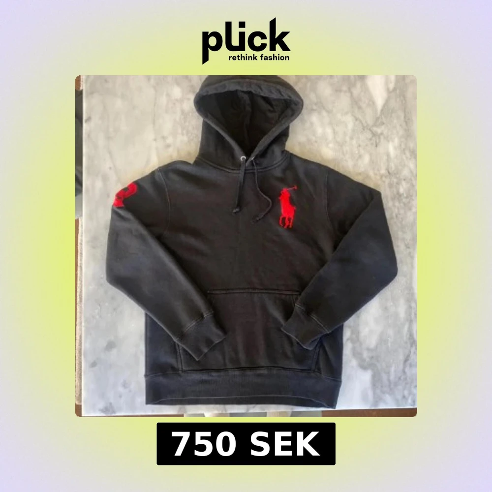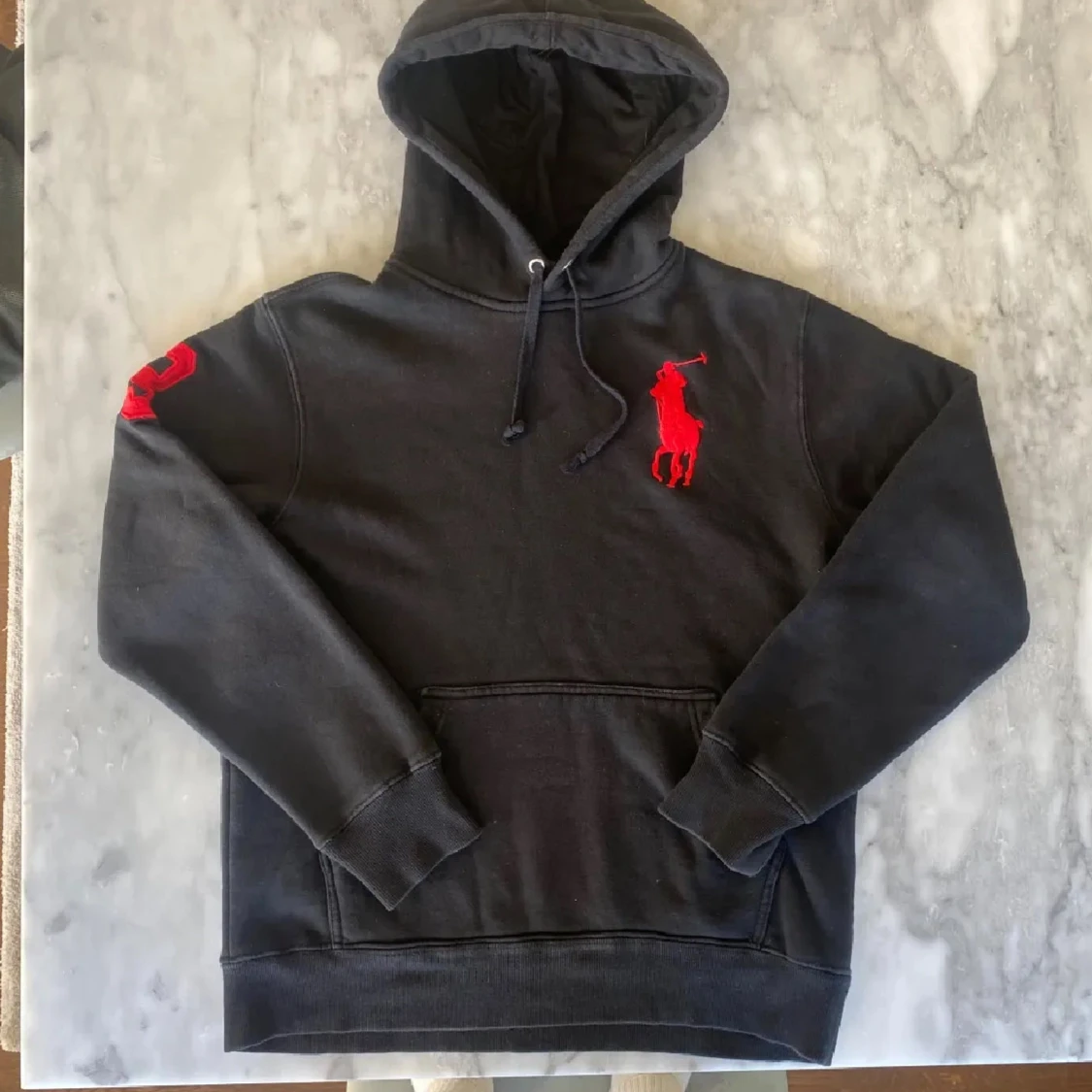 Säljer en svart hoodie från Ralph Lauren med röd broderad logga på bröstet och ärmen. Tröjan har en klassisk känguruficka och justerbar huva med snören. Perfekt för en avslappnad stil. Sick 9 av 10