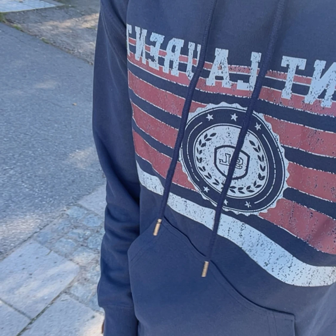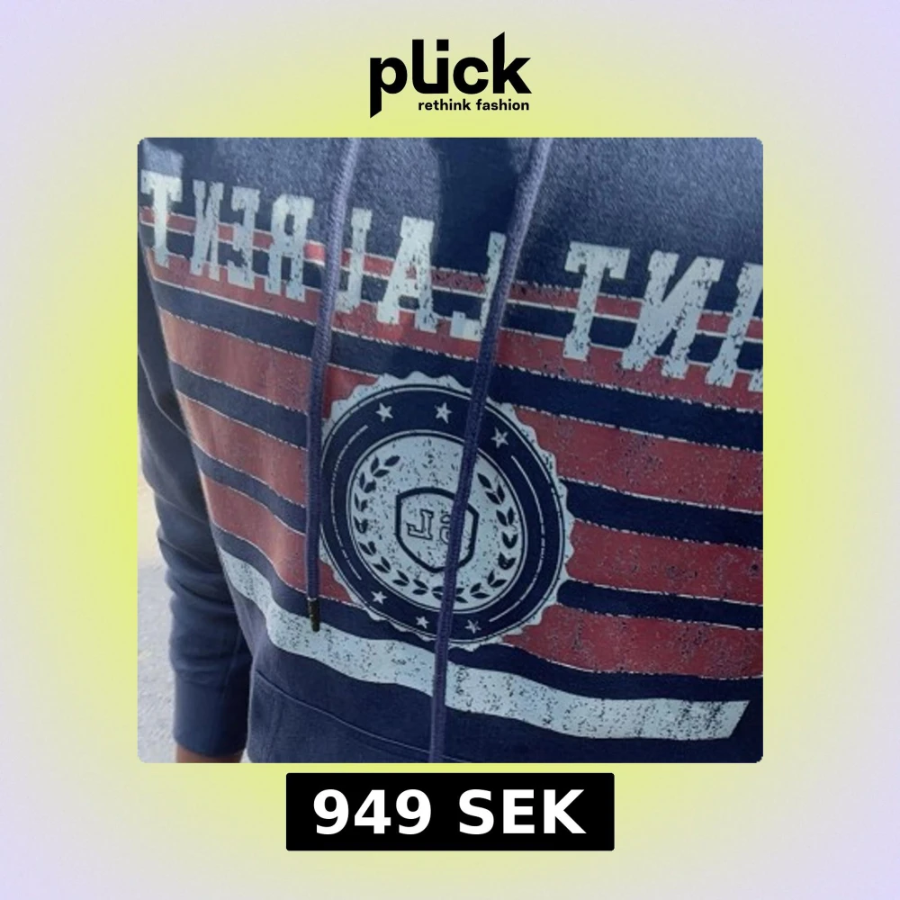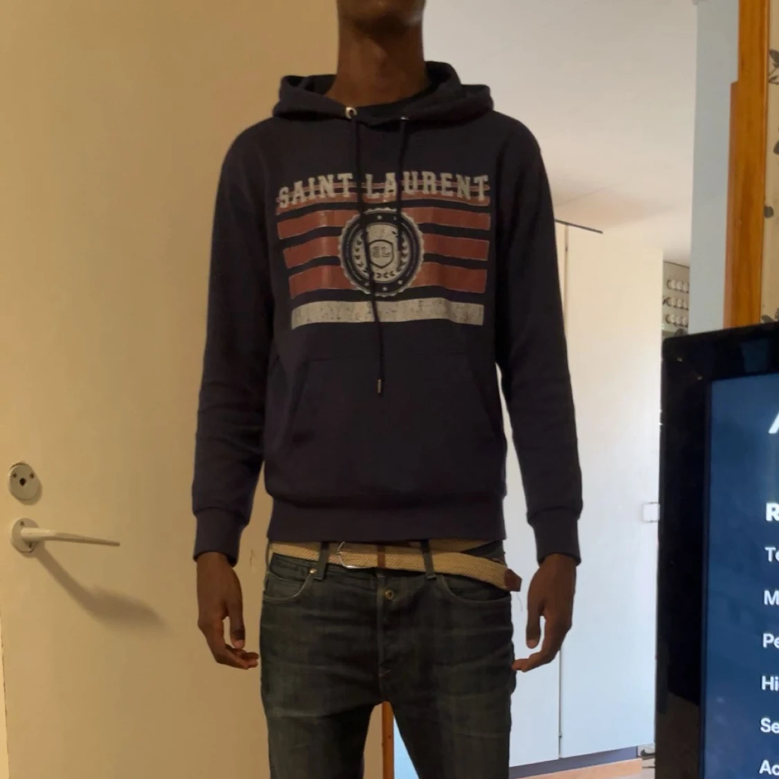 Säljer en marinblå hoodie från Saint Laurent med stort tryck framtill i rött, vitt och blått. Tröjan har snörning i huvan, känguruficka och långa ärmar. Size M men passar skulle säga den sitter som S. Den är nästintill ny då den är använd ett fåtal gånger men ingen prislapp eller förpackning tillkommer.