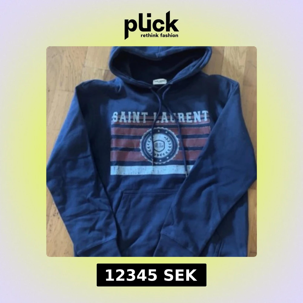 Säljer en blå hoodie från Saint Laurent med tryck framtill i vitt och rött. Tröjan har huva med snörning och en stor magficka. Perfekt för dig som gillar streetstyle och vill ha något bekvämt och snyggt. Storlek är M men passar på S runt 174 cm