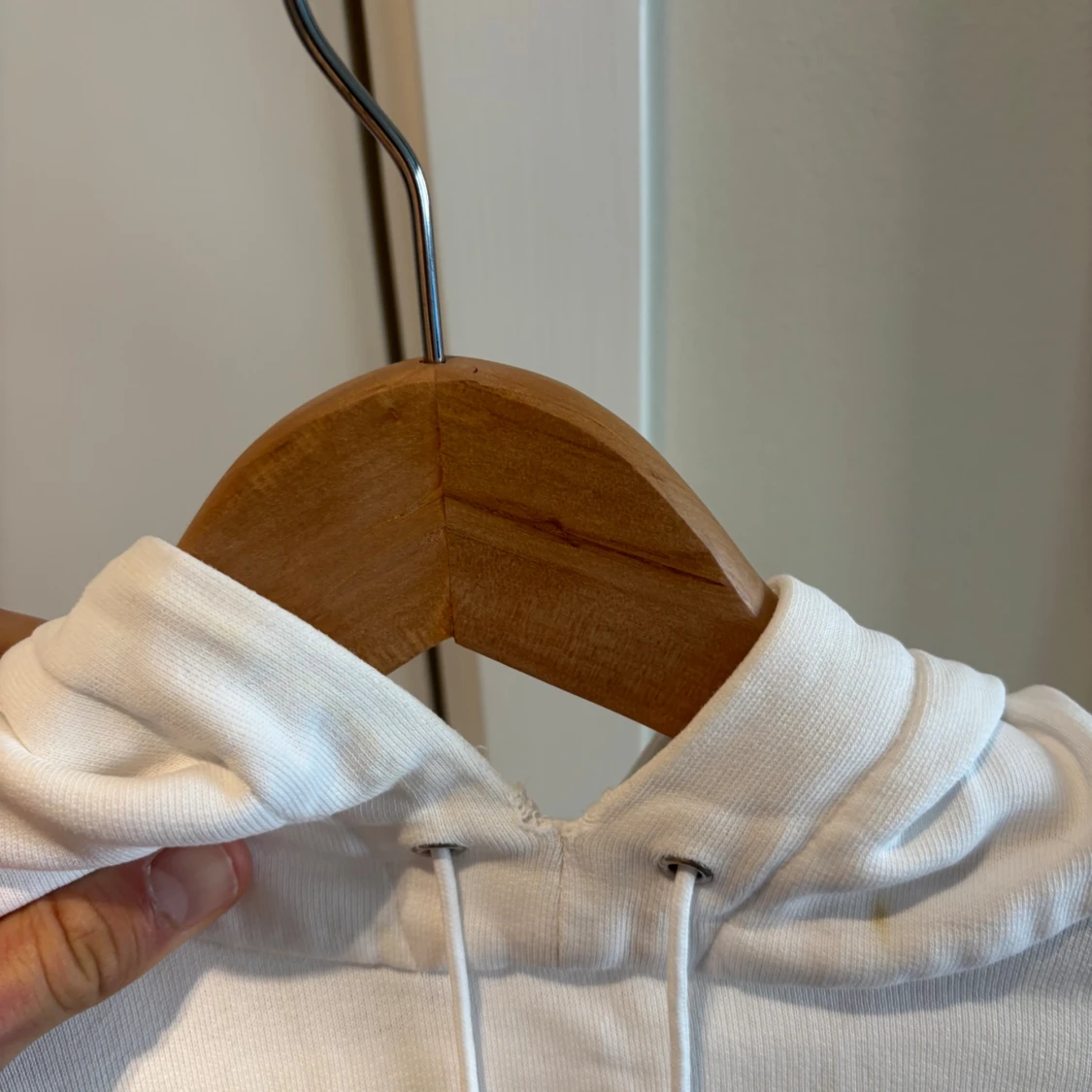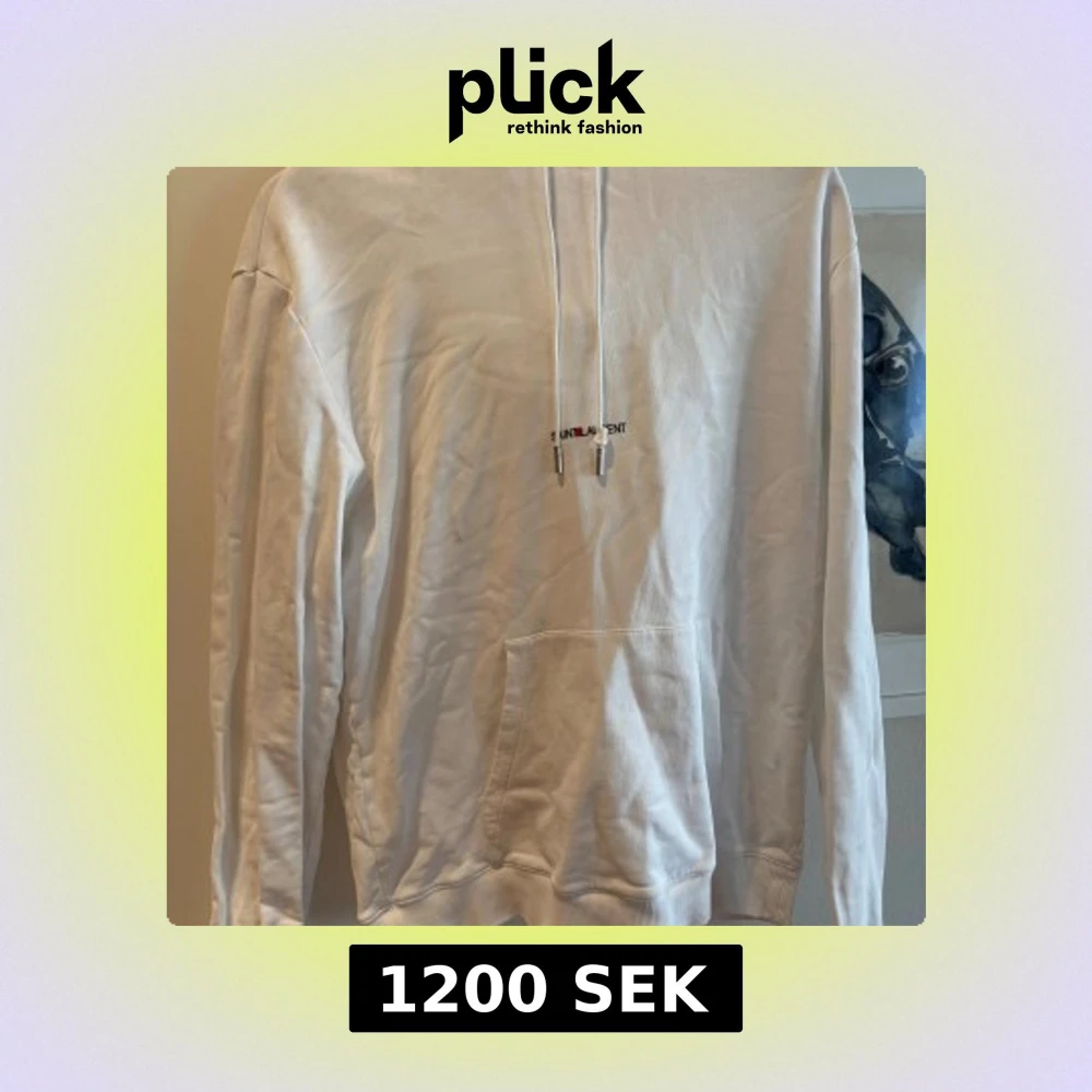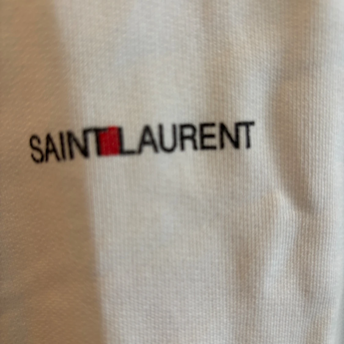 Vit hoodie från Saint Laurent med broderad logga på bröstet. Klassisk känguruficka framtill, dragsko i huvan och ribbade muddar. Tillverkad i mjuk bomull, perfekt för en clean och stilren look. Finns några fläckar/de flaws (se bilderna)