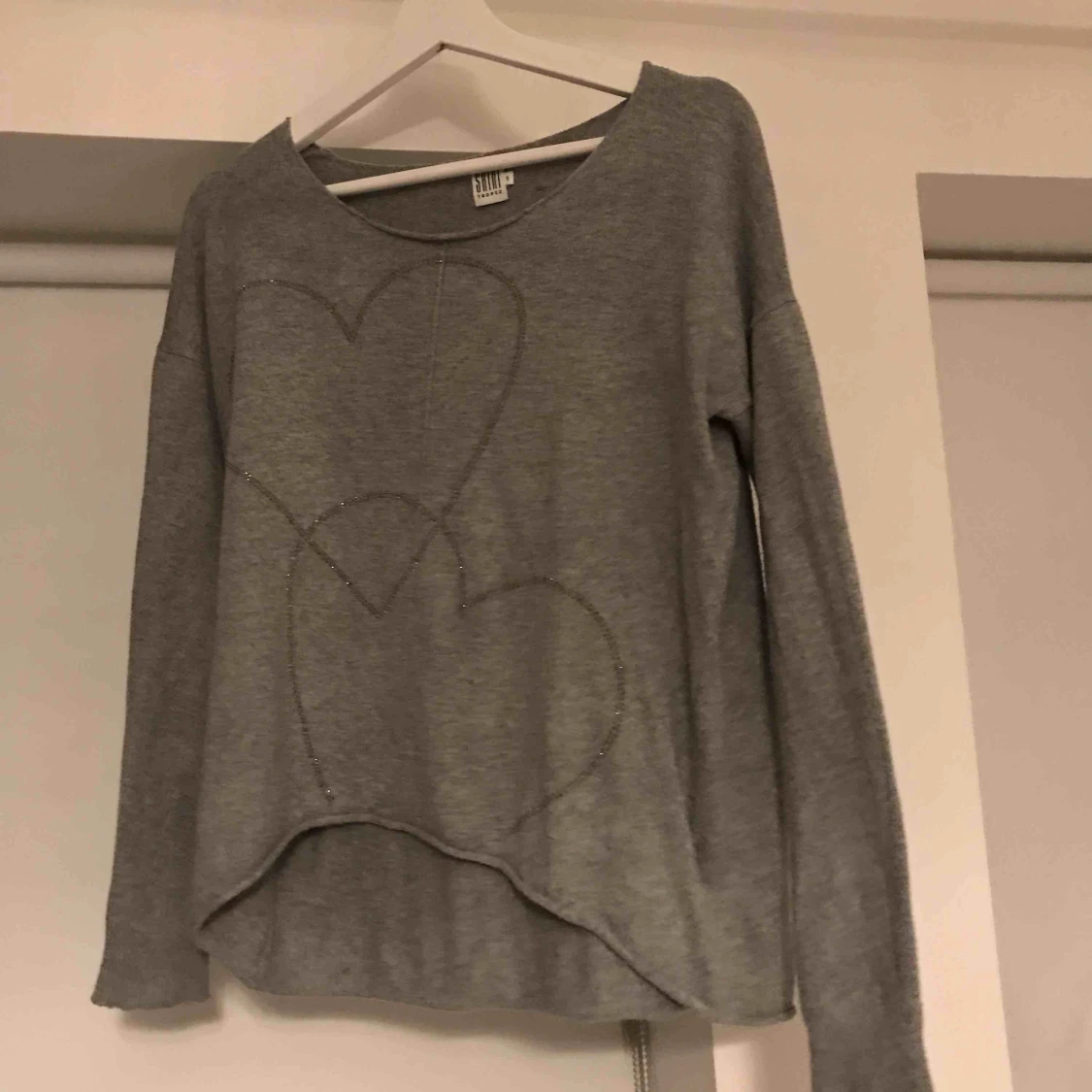 Jättefin och höstig långärmad tröja med kristaller formade som hjärtan. Använd men fint skick. Passar de flesta, sitter stort på mig som har S. Tar endast swish💕