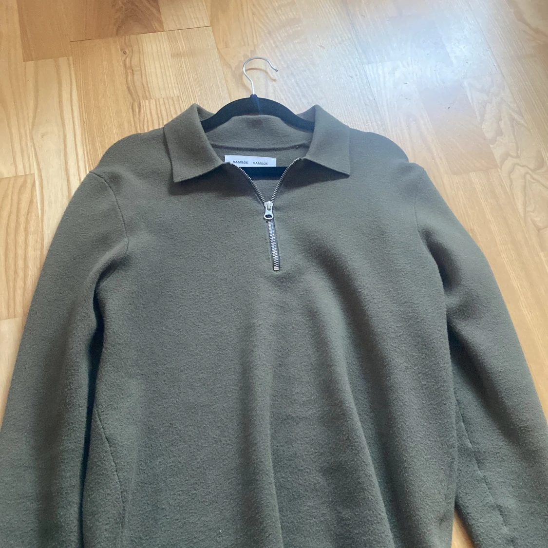 Säljer en olivgrön långärmad tröja från Samsøe Samsøe med krage och dragkedja framtill. Tröjan har en klassisk passform och är tillverkad i ett mjukt material som passar perfekt till kalla vårkvällar