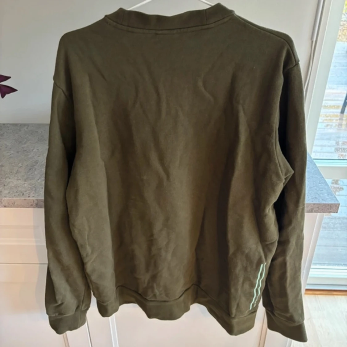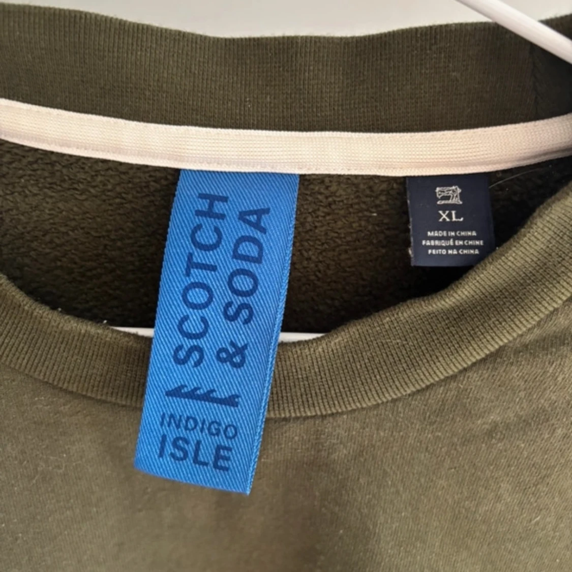 Säljer en olivgrön tröja från Scotch & Soda med ett unikt broderat märke på bröstet. Tröjan har långa ärmar och en rund halsringning. Perfekt för en avslappnad stil.