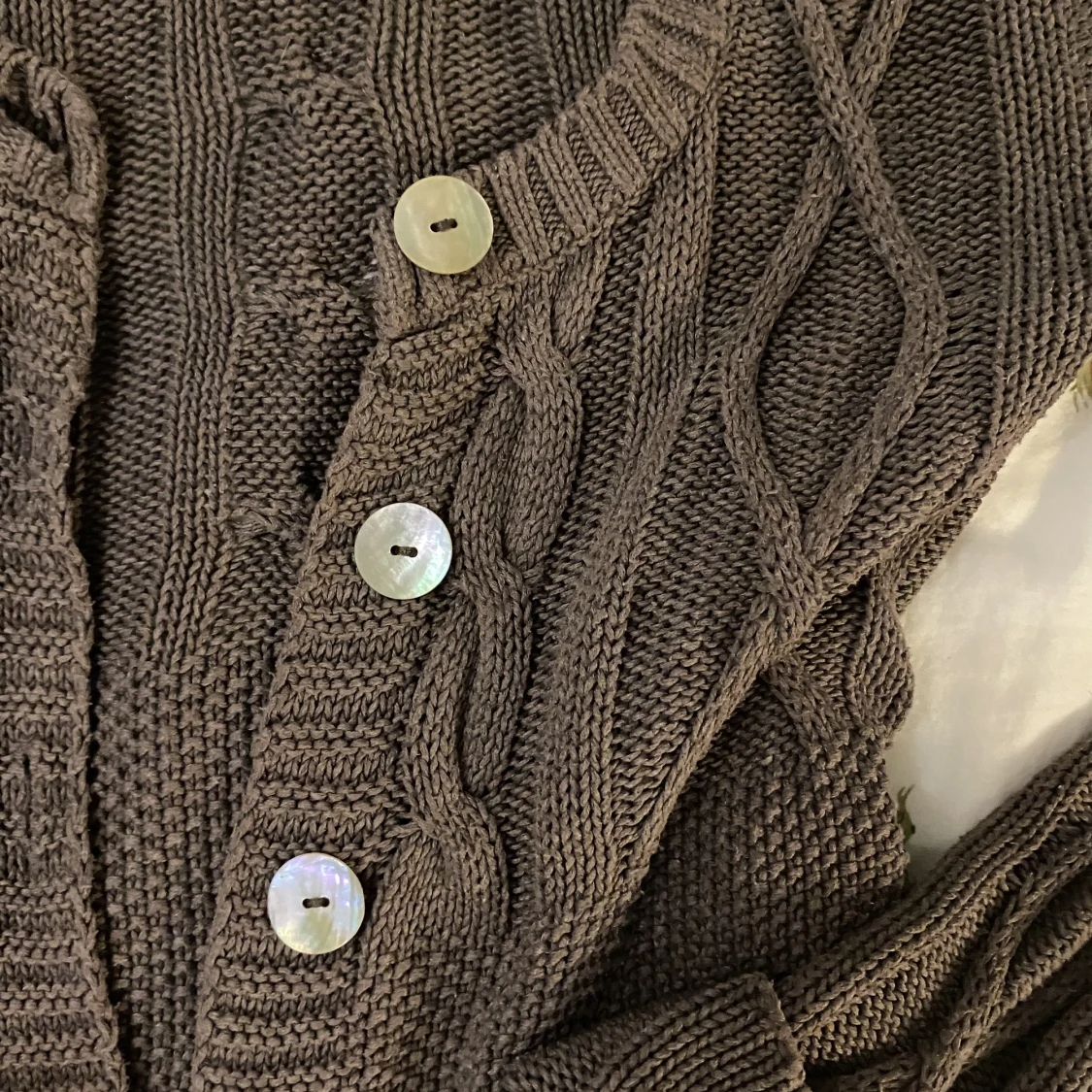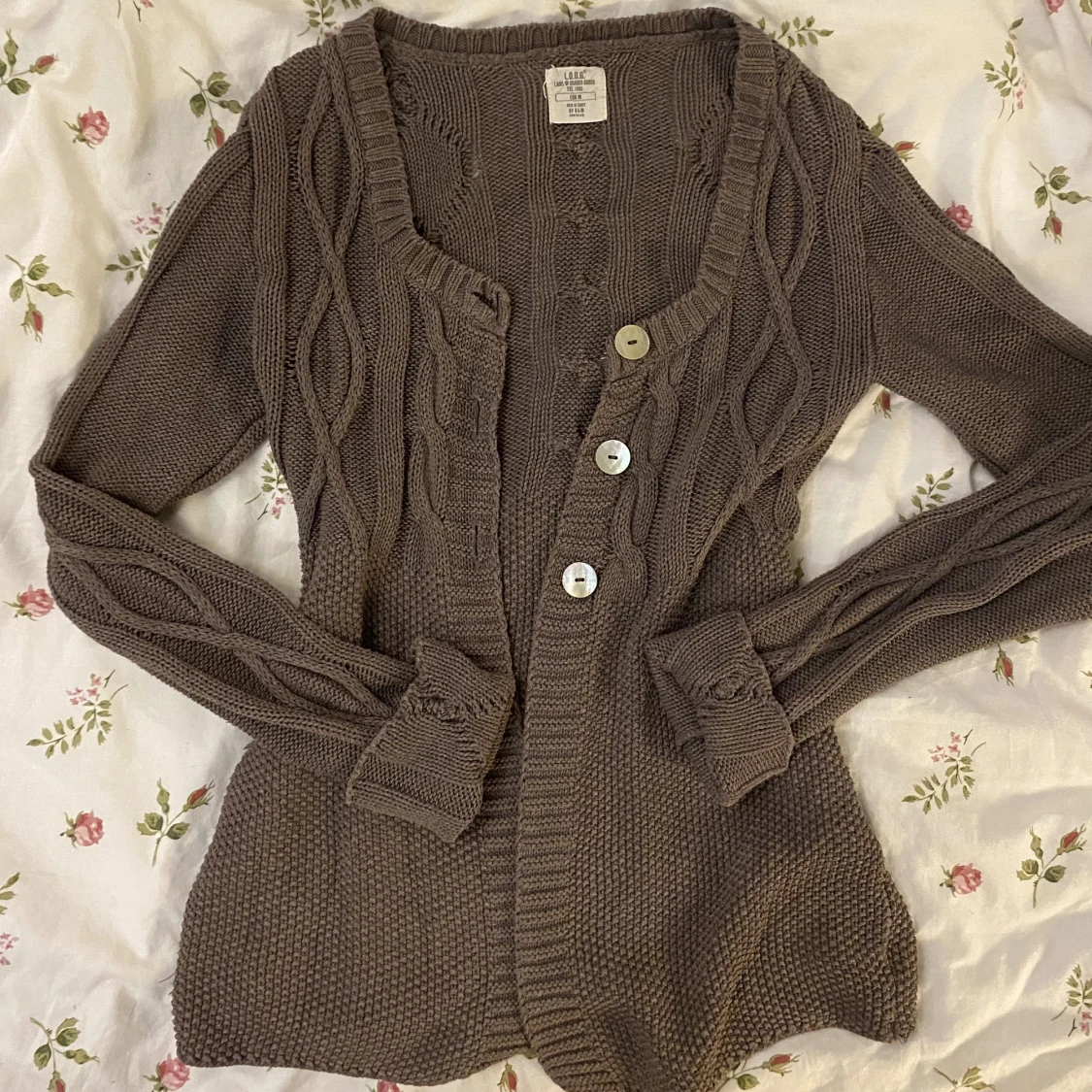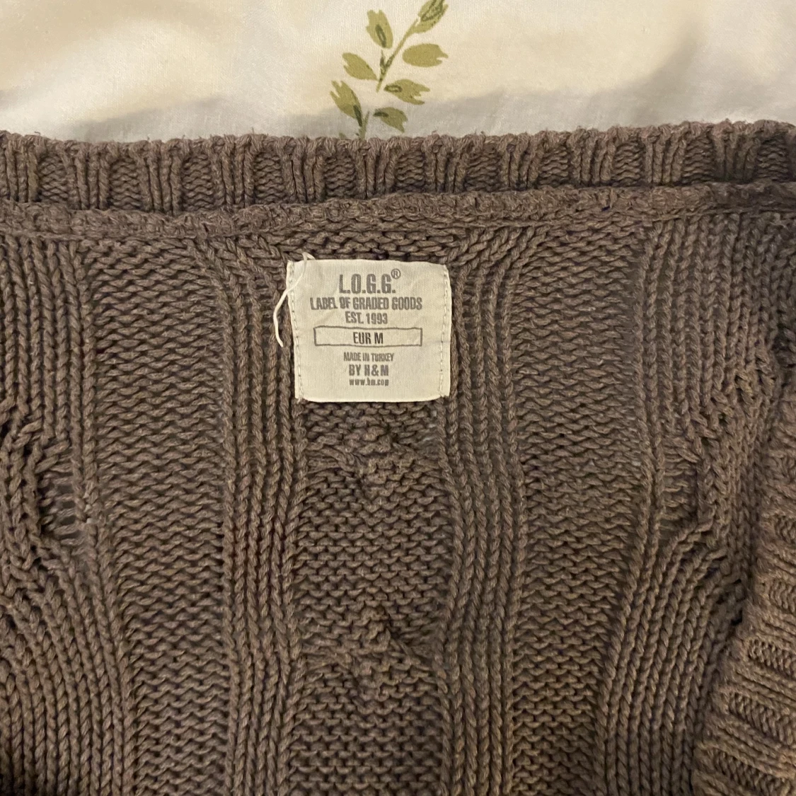 Det är en brun typ stickad kofta, är lite längre. Är storlek M men skulle säga att den är typ S om man viker upp armarna. Skriv vid fler frågor 💕