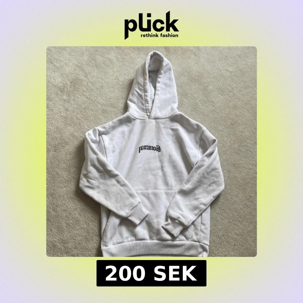 Säljer en vit hoodie med texten 'paranoid' tryckt på framsidan och ett stort kors med samma text på baksidan. Hoodien har en klassisk passform med långa ärmar och en stor ficka framtill. Perfekt för en avslappnad stil.