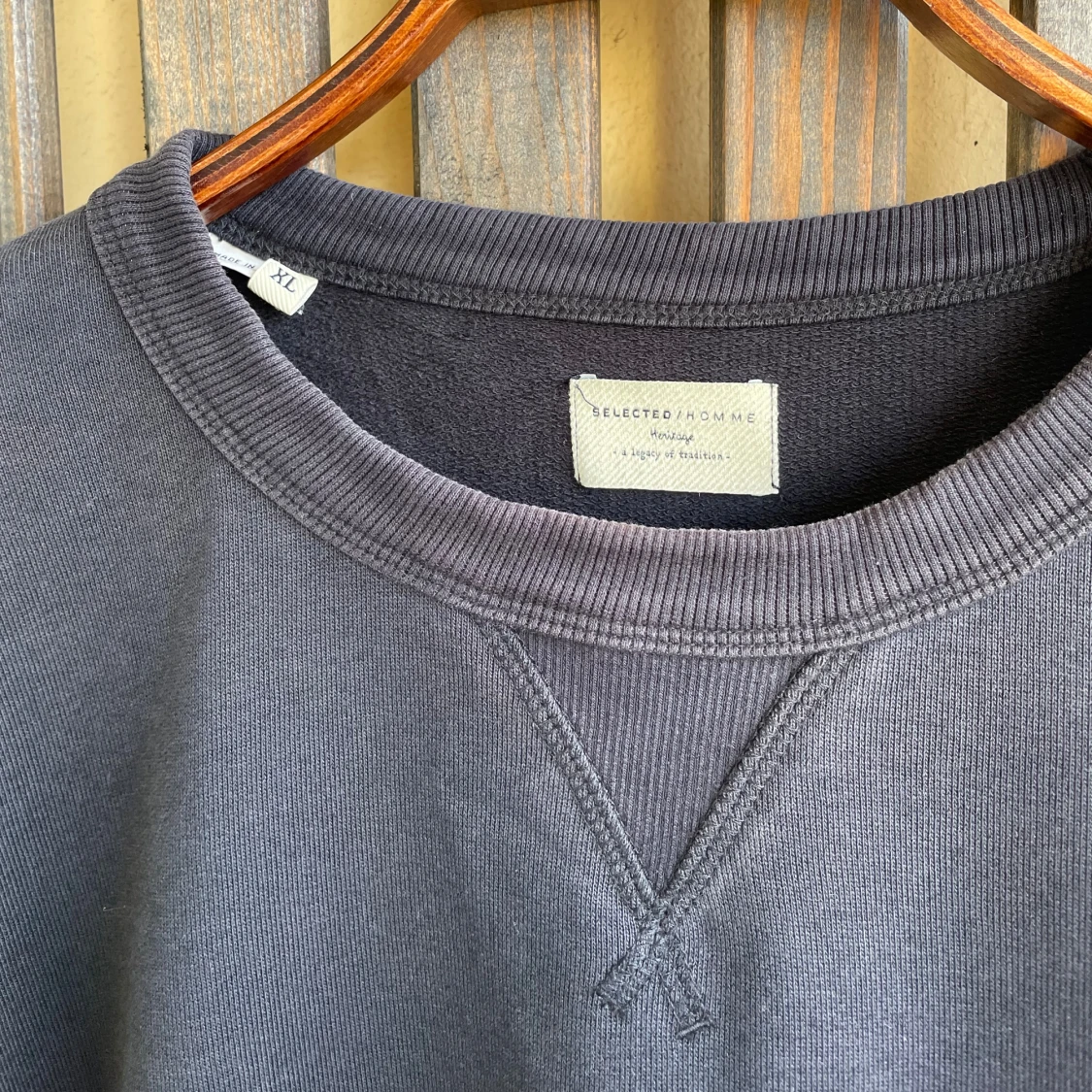 En stilren solblekt svart sweatshirt från Selected Homme i rättare sagt M/L än XL som tröjan var vid köp. Tröjan har rund halsringning med ribbade muddar vid ärmslut och nederkant. Tillverkad i mjuk bomull, perfekt för en avslappnad look. Två små hål visas på bild.
