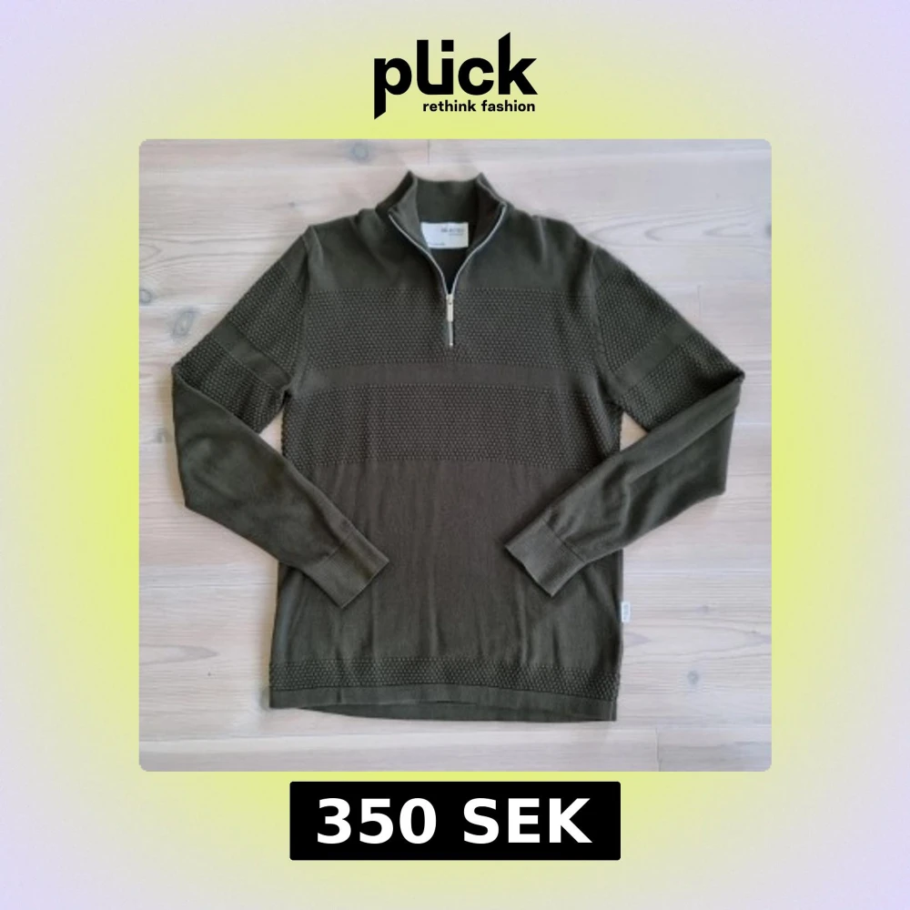 Säljer en olivgrön stickad tröja från Selected Homme i storlek M. Tröjan har en halv dragkedja vid halsen, ribbade muddar och ett diskret strukturerat mönster över bröstet och ärmarna. Perfekt för lager-på-lager under hösten och vintern.