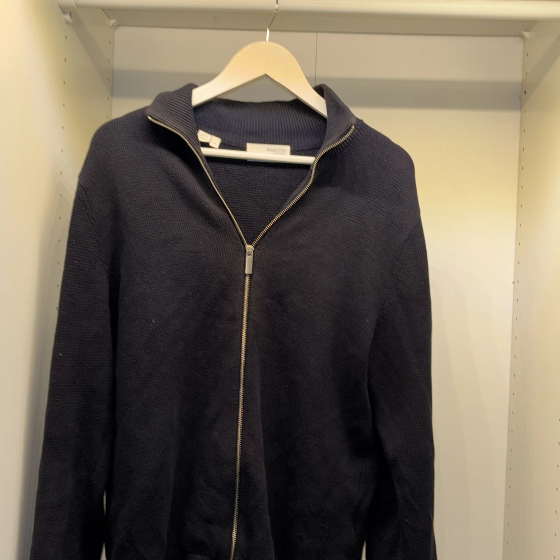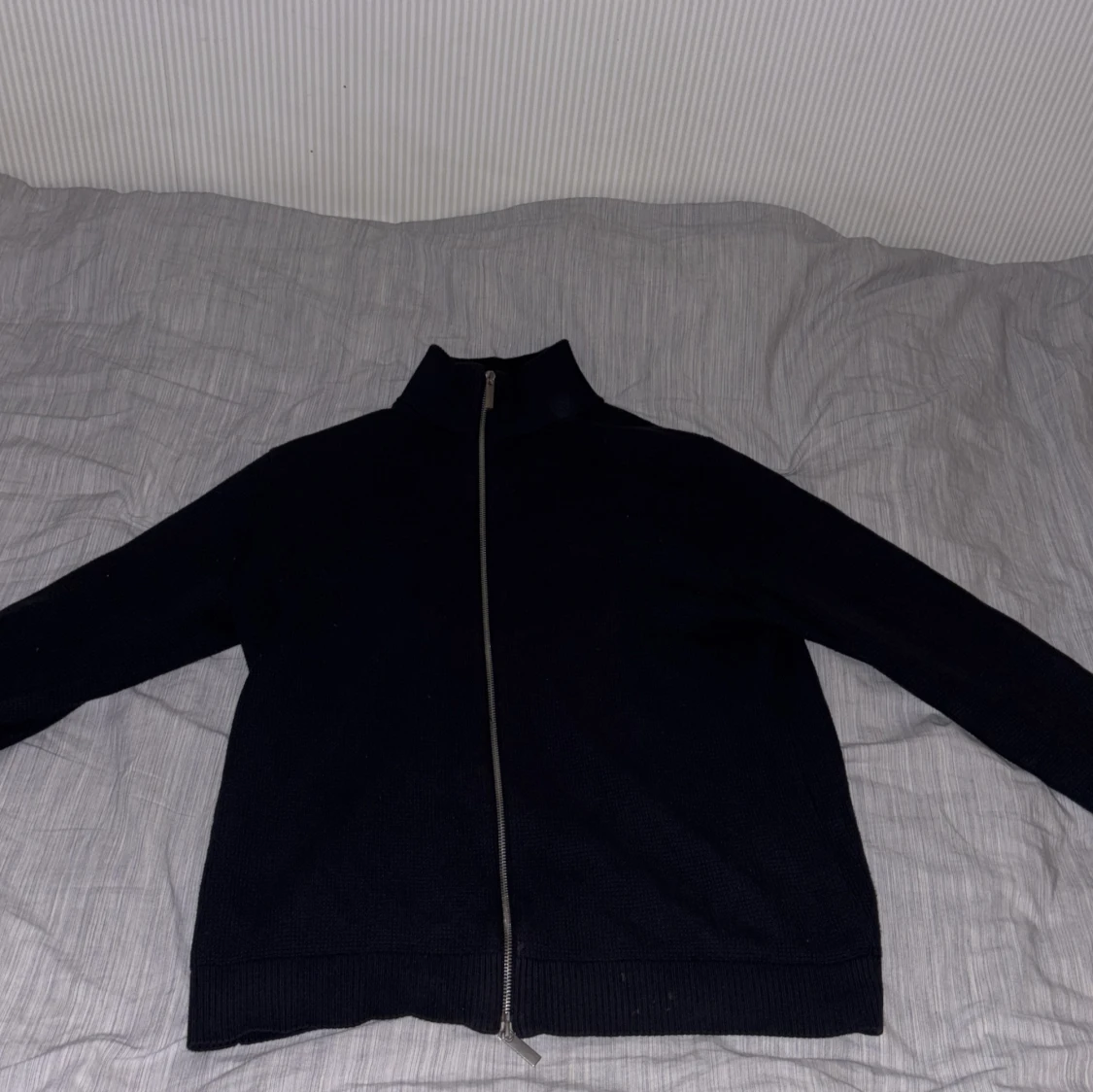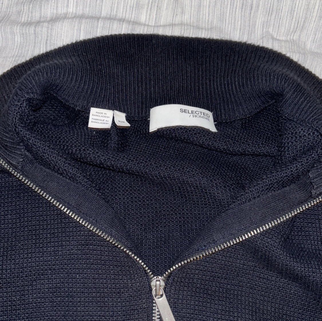 Mörkblå stickad kofta från Selected Homme med hel dragkedja framtill och hög krage. Klassisk och stilren modell i mjuk bomullsblandning, perfekt för lager-på-lager under kyliga dagar. Långärmad och ribbade muddar vid ärmslut och nederkant.