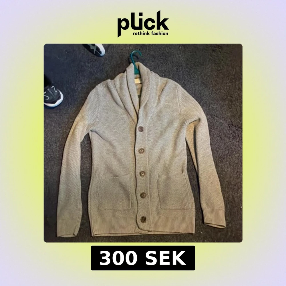 Säljer en grå stickad kofta från Selected Homme med grov struktur, sjalkrage och stora bruna knappar. Koftan har två framfickor och ribbade muddar vid ärmslut och nederkant. Perfekt för dig som gillar chill och stilren look.