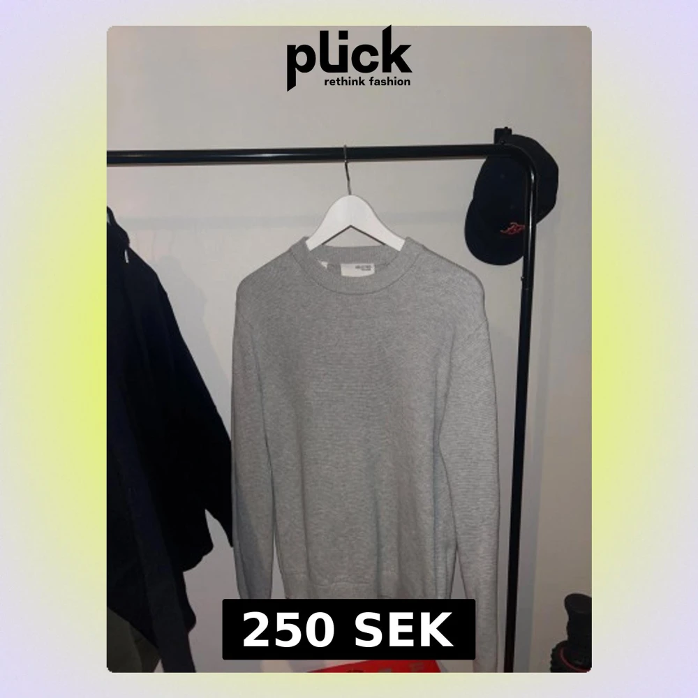 Säljer en stilren ljusgrå stickad tröja från Selected Homme. Tröjan har rund halsringning, ribbade muddar och är långärmad. Använd 1 gång.