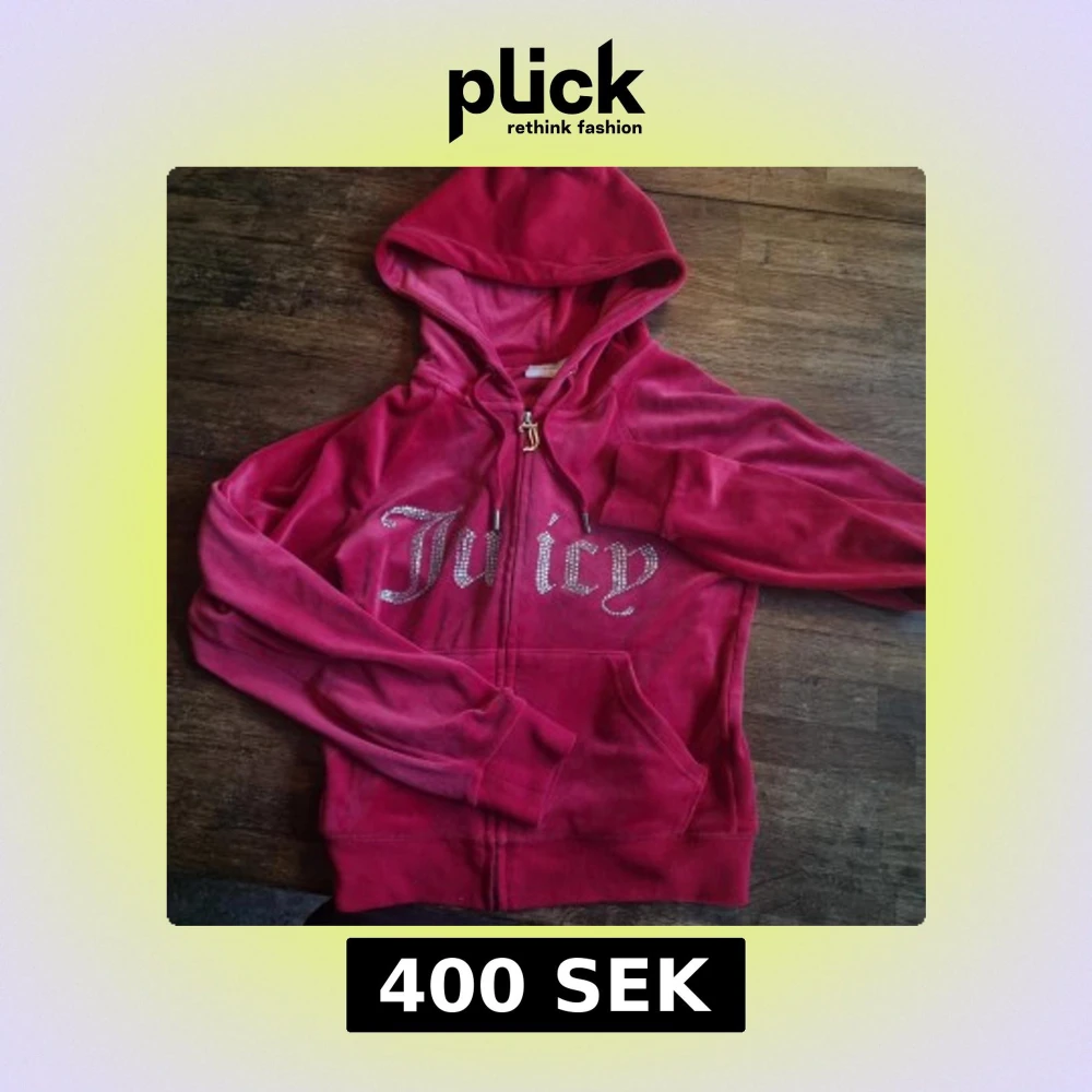 Säljer en ikonisk zip-up från Juicy Couture. Tröjan har huva, dragkedja med J-berlock och glittrande Juicy-text i strass på bröstet. Perfekt för dig som gillar 2000-talsvibbar och comfy stil.