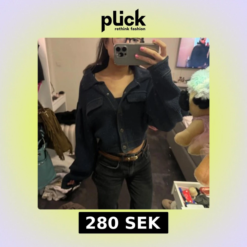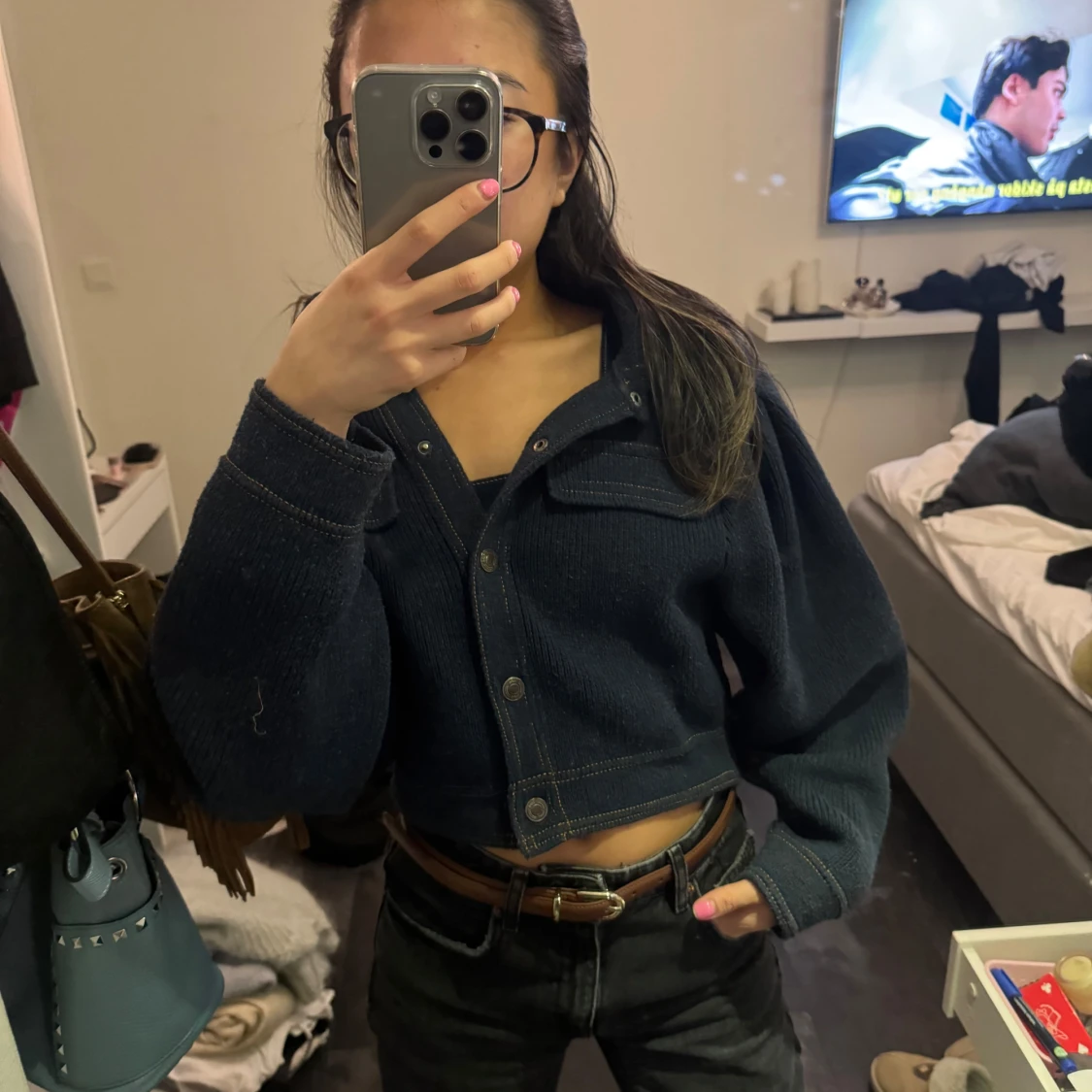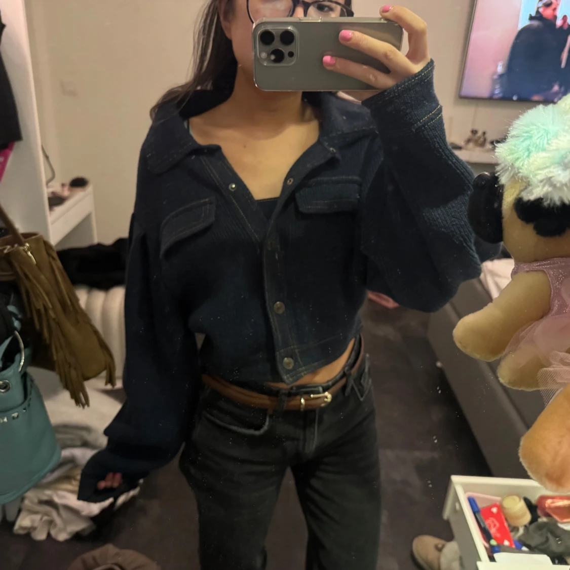 Säljer en mörkblå kortare kofta med knappar framtill och en matchande topp . Koftan har en oversized passform och långa ärmar. Perfekt för en avslappnad stil.