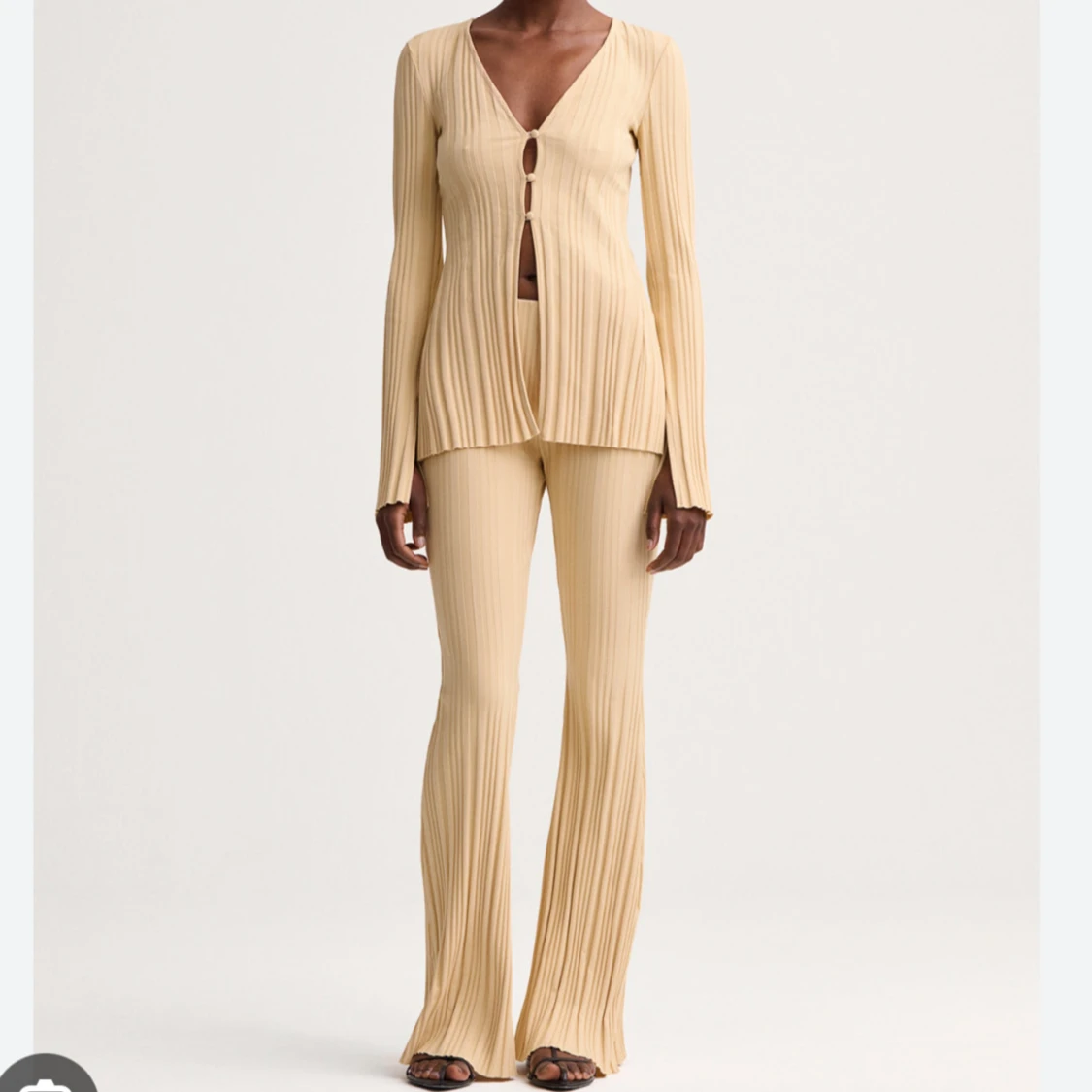 Snygg beige ribbad topp med lång ärm och v-ringning. Toppen har dekorativa knappar framtill och en stilren design som passar perfekt till både vardag och fest. Perfekt för höst och vår!