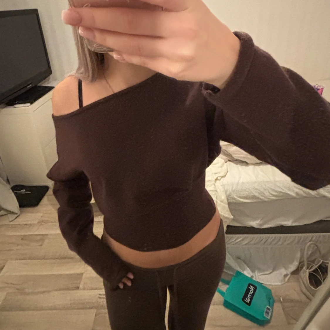 Säljer en brun stickad tröja med offshoulder-design och bred mudd i midjan. Tröjan har lång ärm och en loose passform upptill som smalnar av vid midjan. Perfekt för dig som gillar en chill men ändå snygg stil.