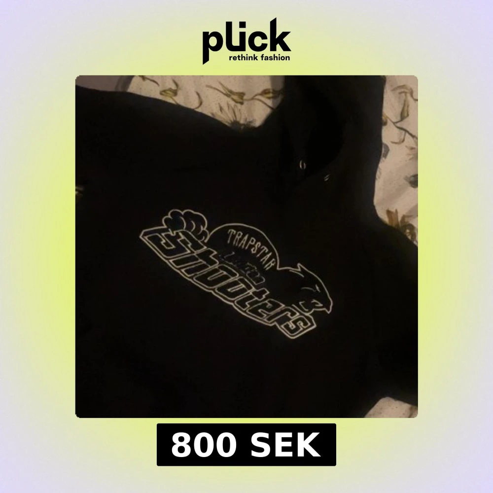 Säljer en svart hoodie från Trapstar med trycket 'Shooters' på framsidan. Hoodien har en klassisk design med en stor ficka framtill och en justerbar huva. Perfekt för en avslappnad stil.
